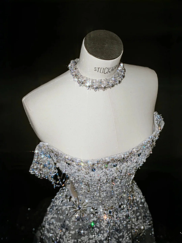 White one-shoulder diamond slim waist A-line elegant long skirt, prom dress R5640