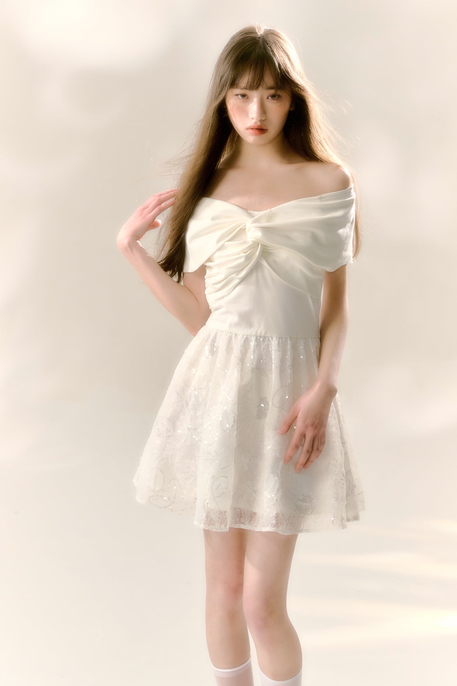 White one-shoulder dress knitted splicing sequined tutu skirt R5172