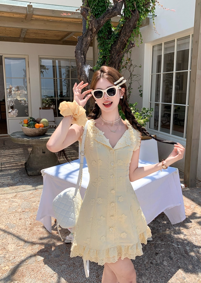 Yellow sleeveless waist a-line dress women's summer French temperament skirt R4622