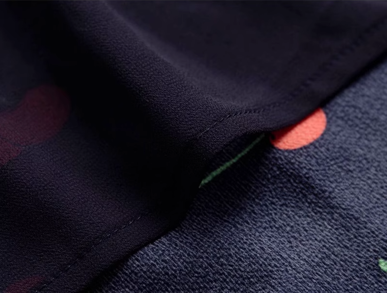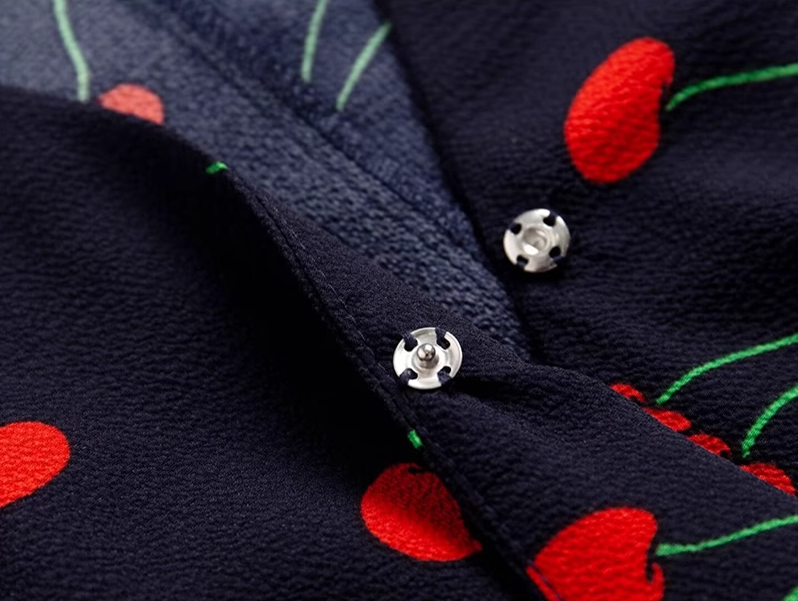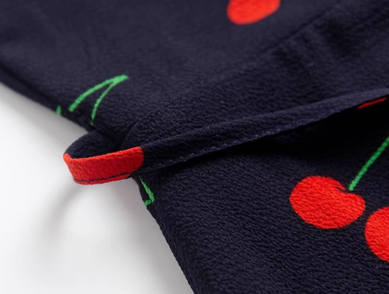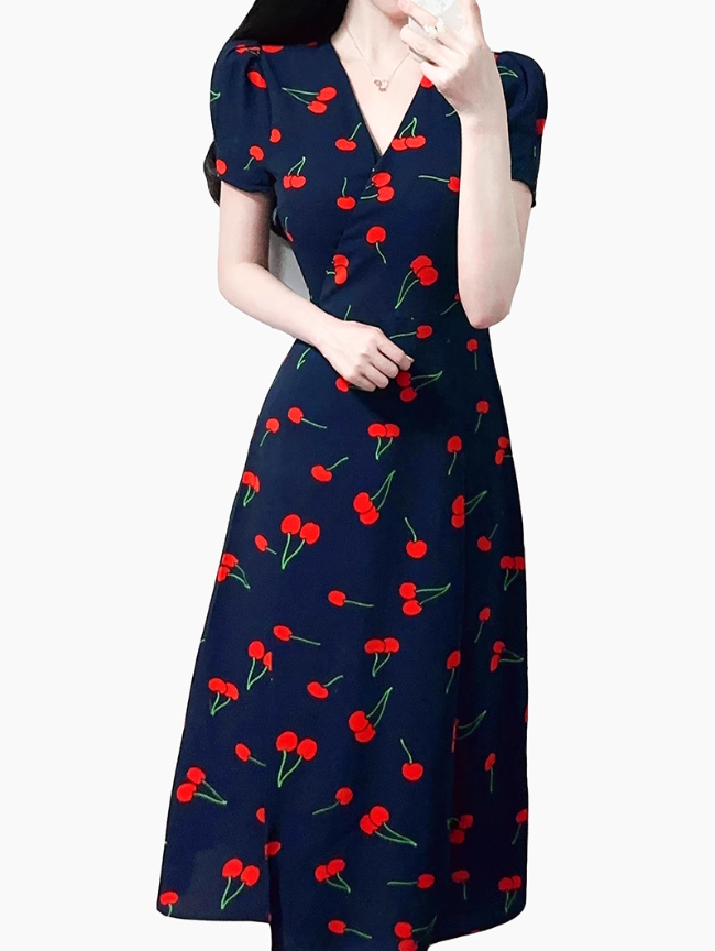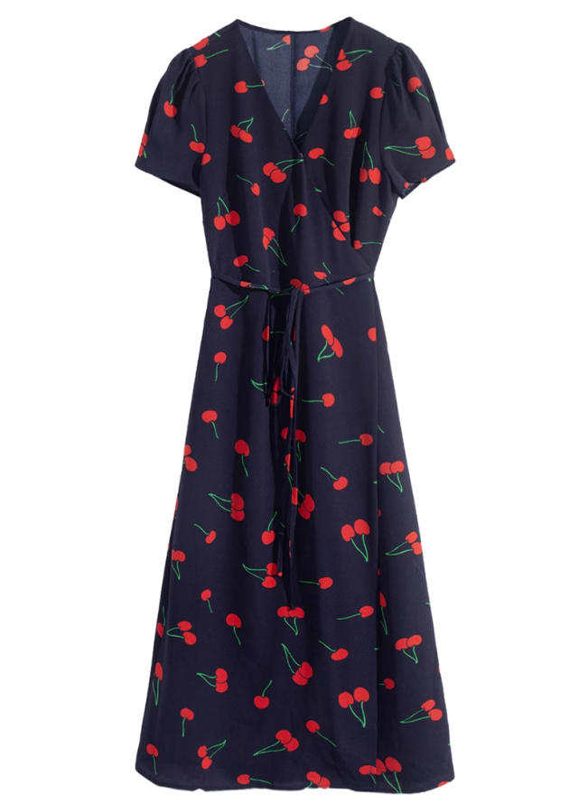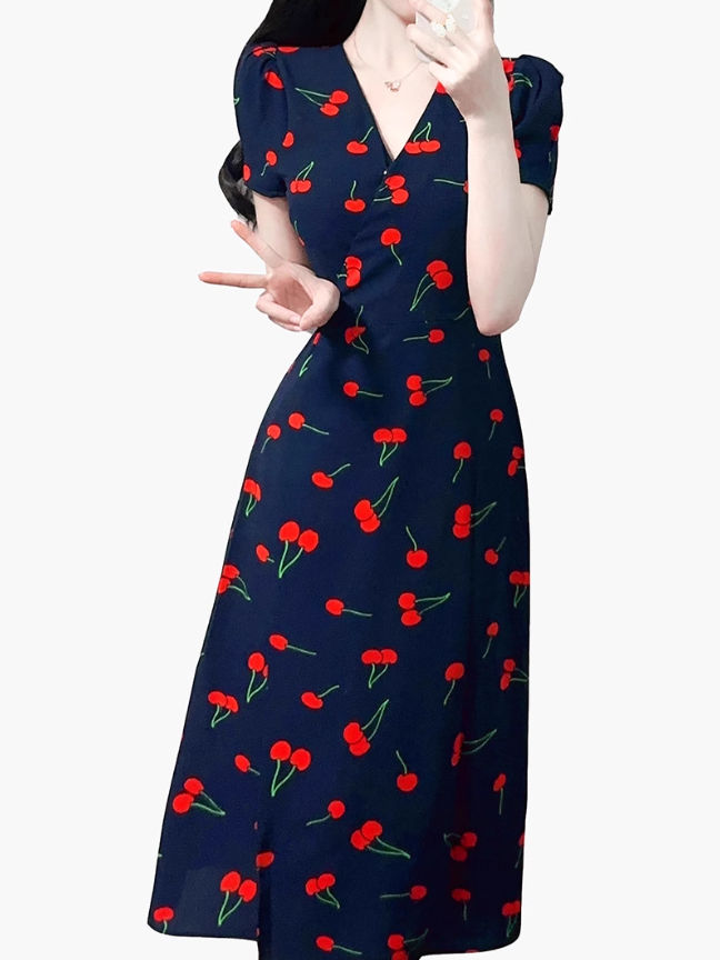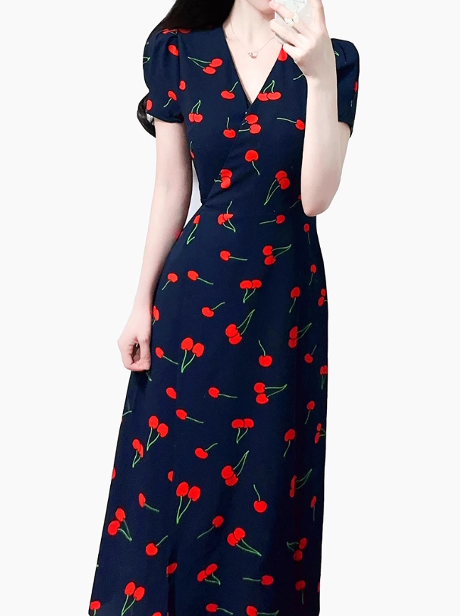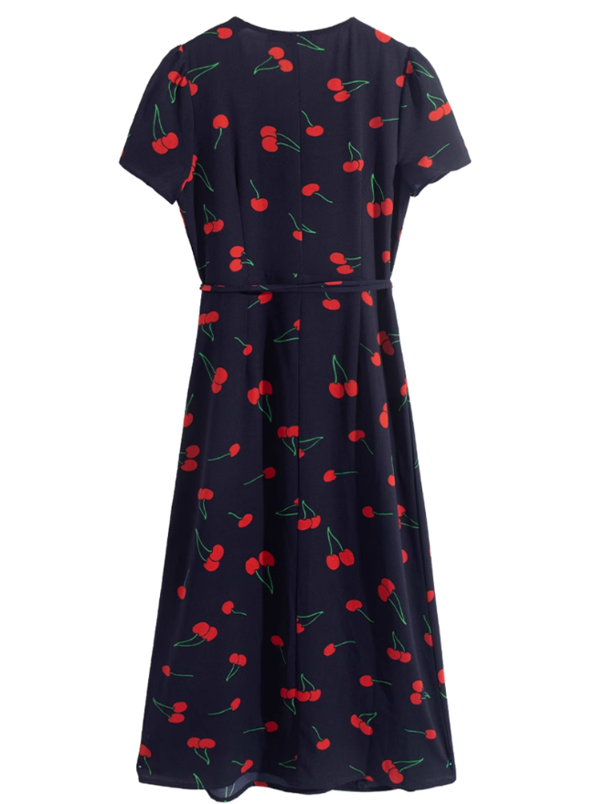 2025 Summer New Black V-neck Short Sleeve Cherry Print Wrap Long Dress R0920