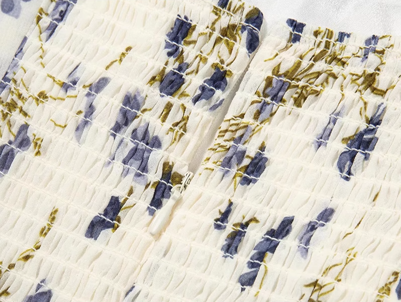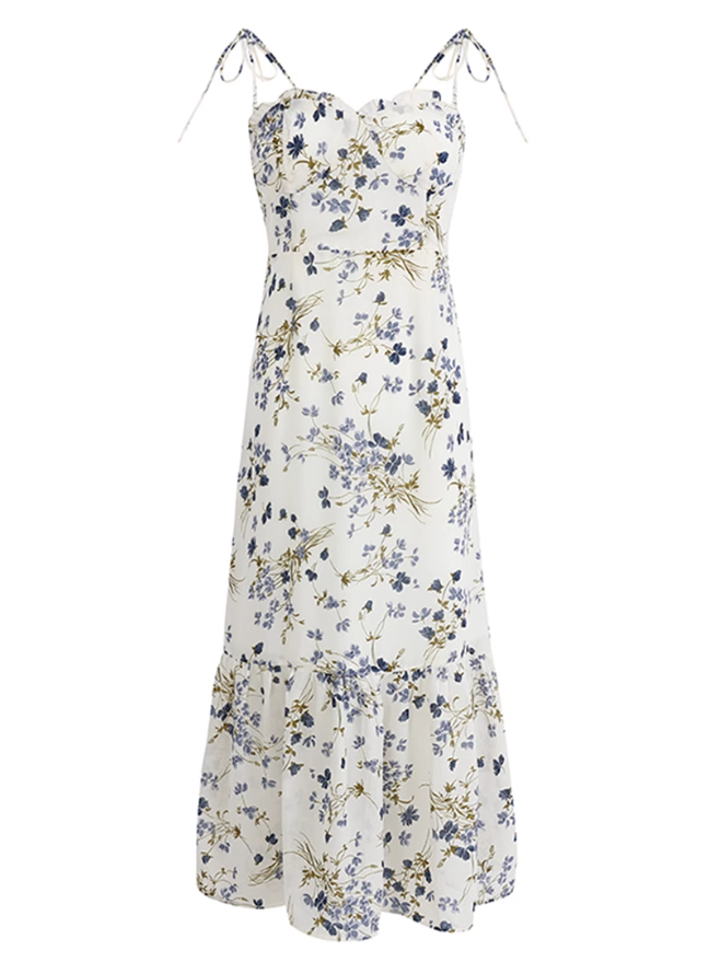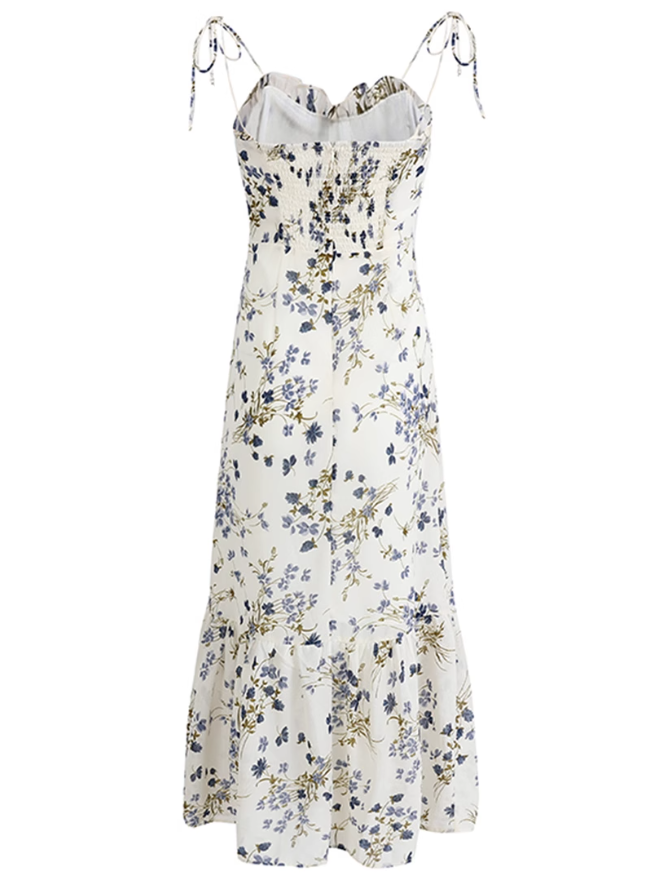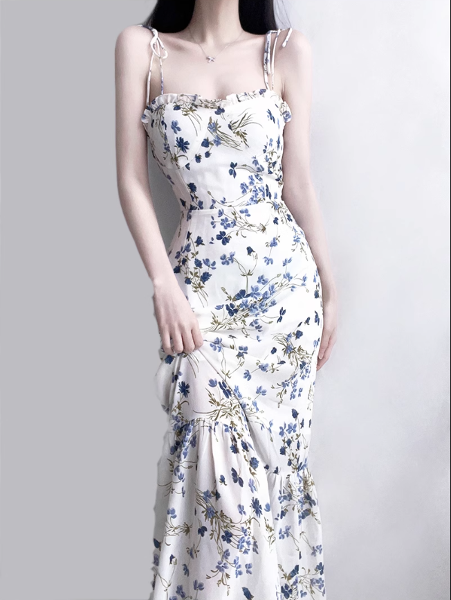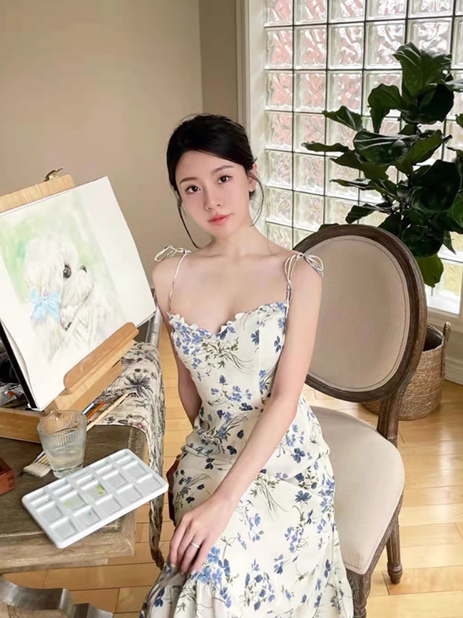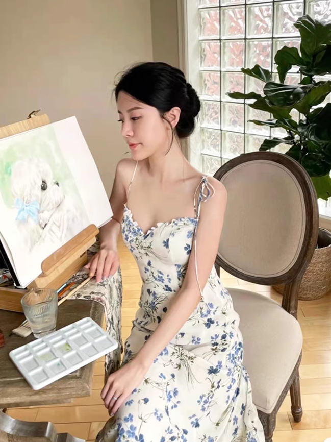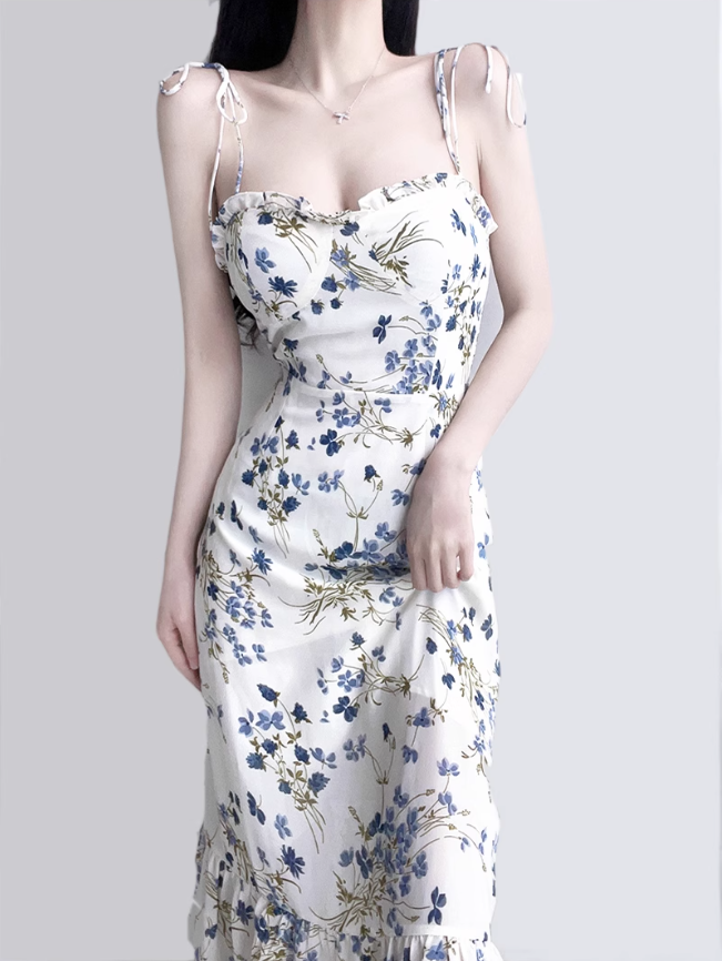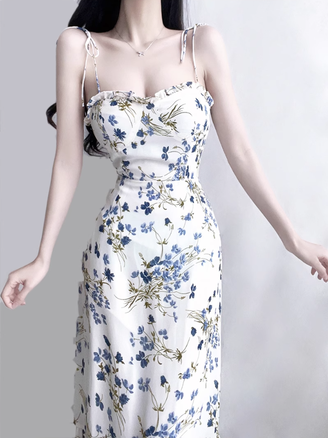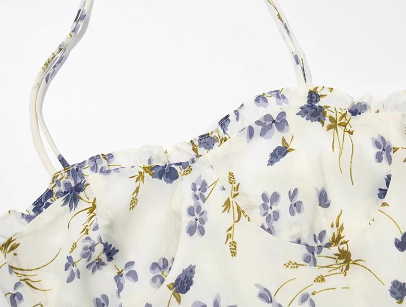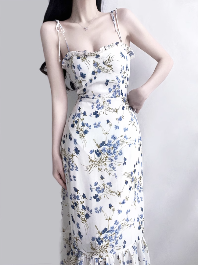 2025 Summer New French Blue Floral Holiday Style Mid-Length Suspender Dress R0923