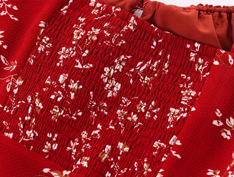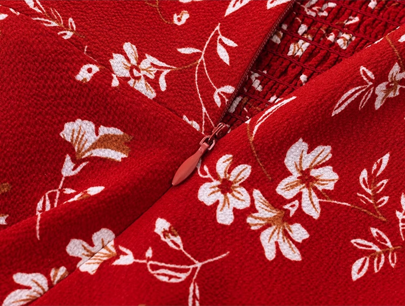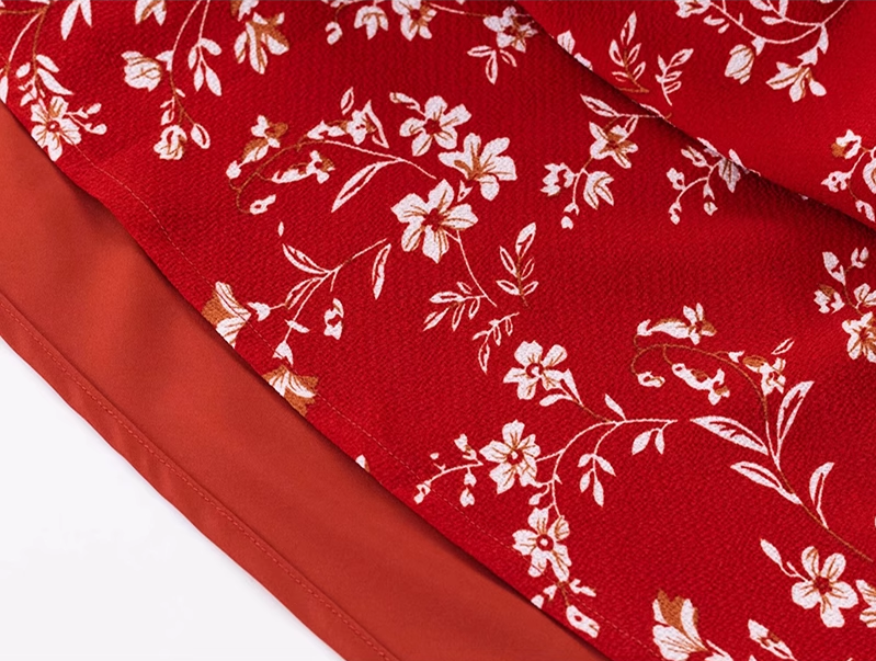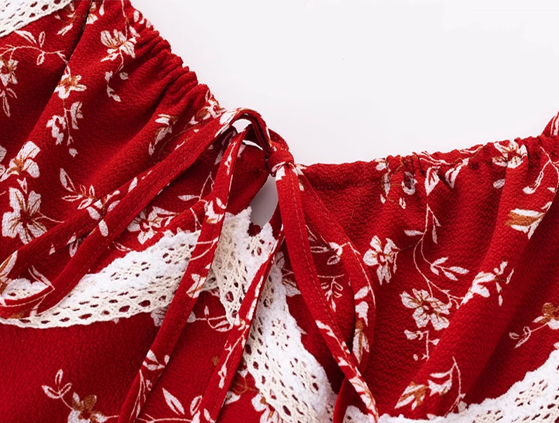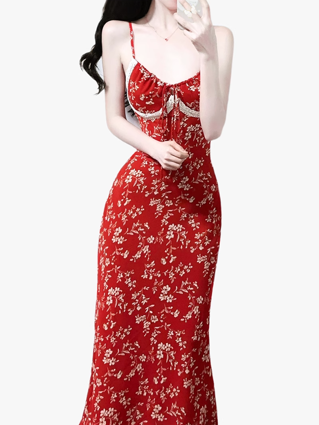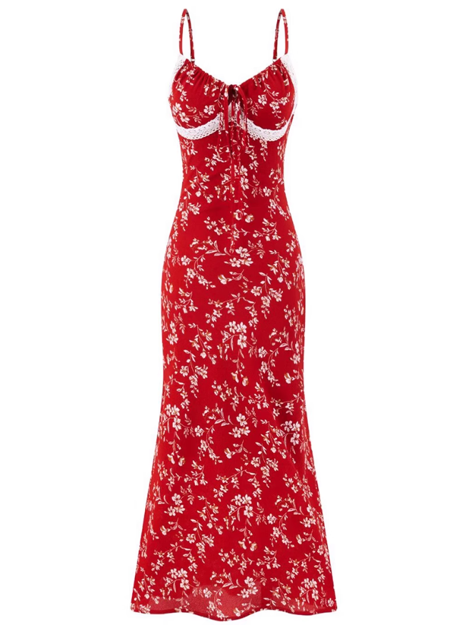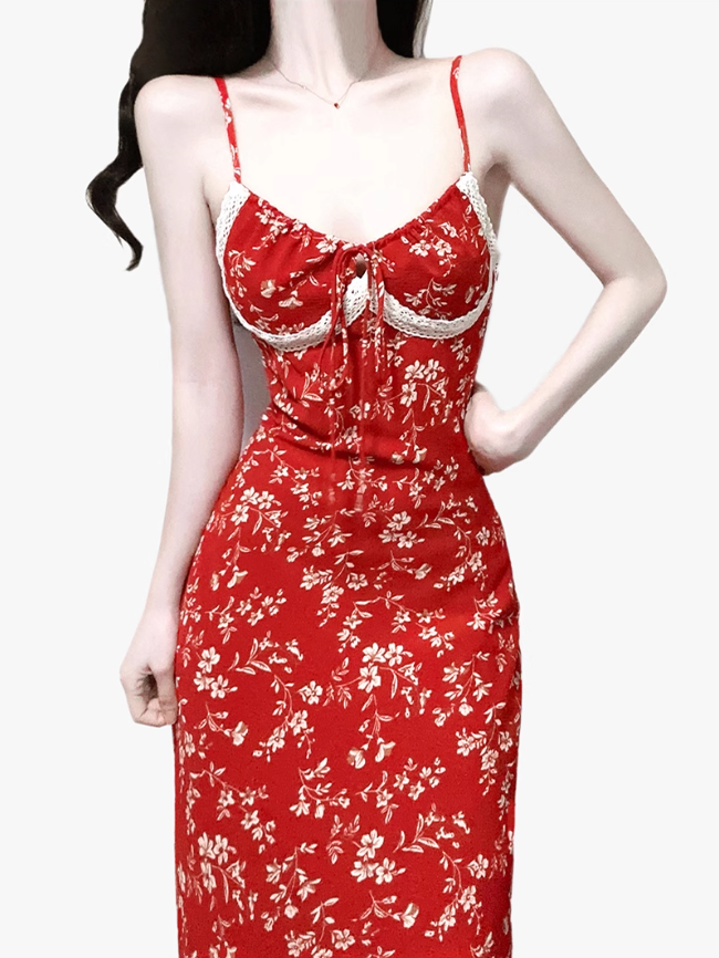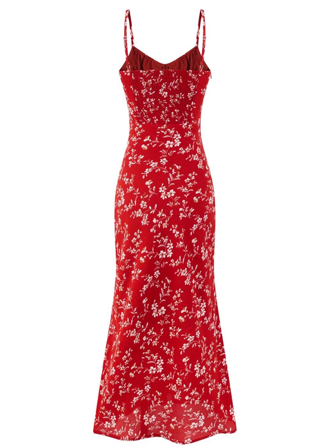 2025 Summer New Red Floral Sexy V-neck Mid-length Holiday Suspender Dress R0919