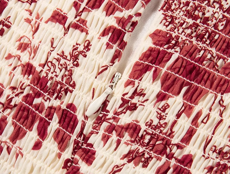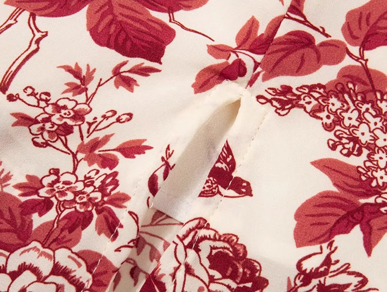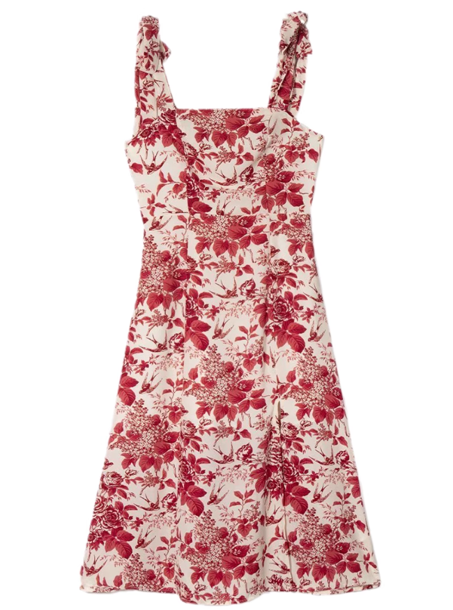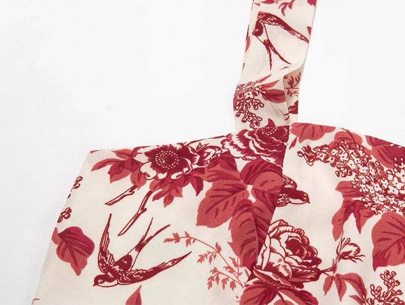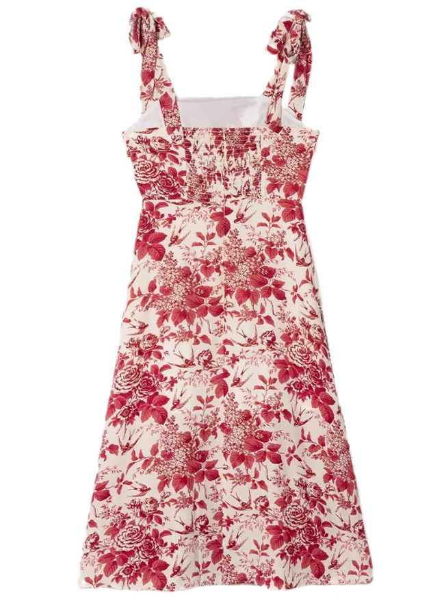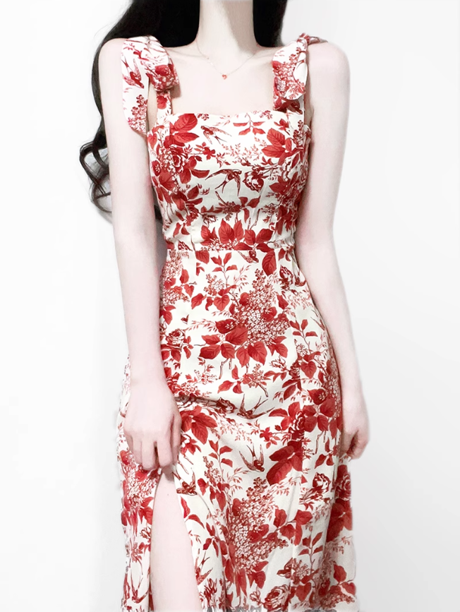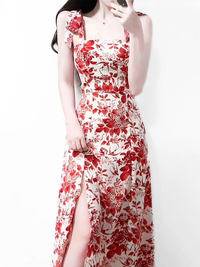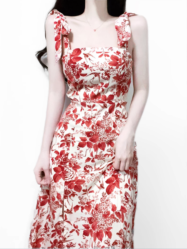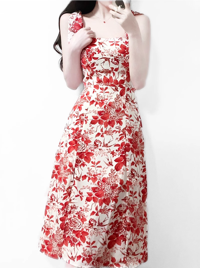 2025 Summer New Romantic Red Floral Waist Tie Holiday Suspender Dress R0922