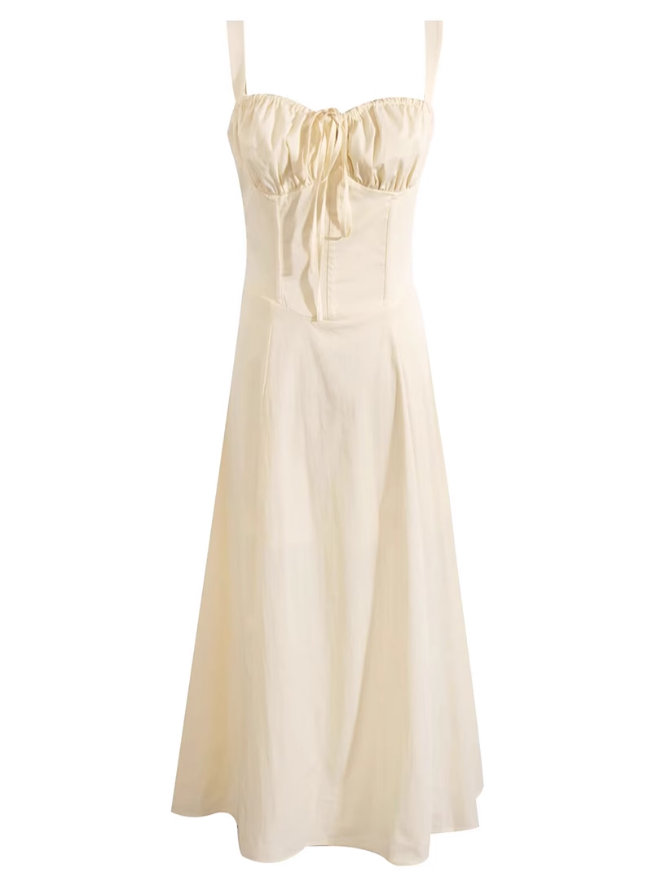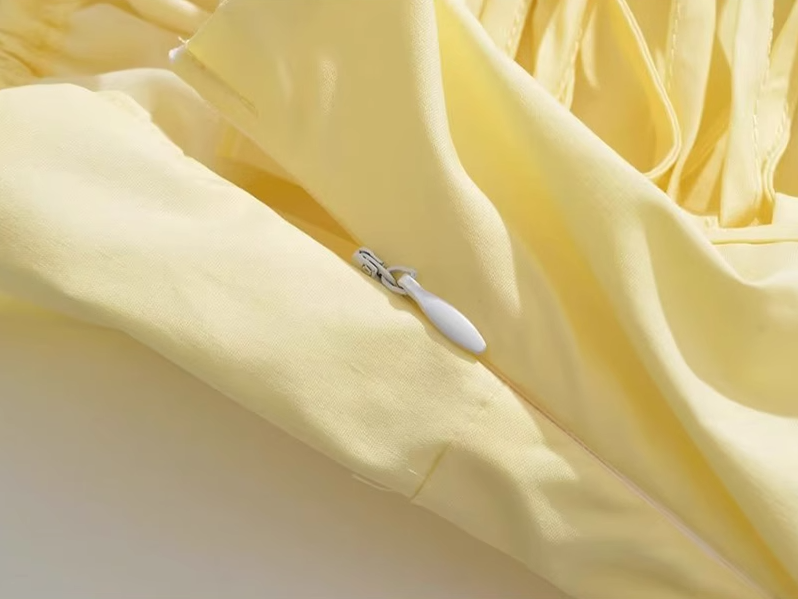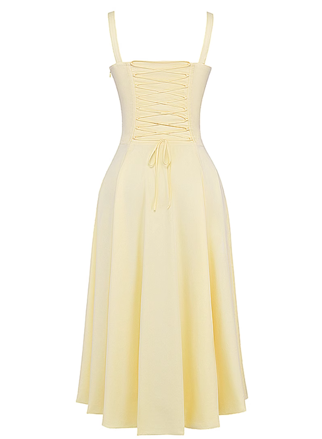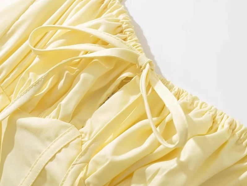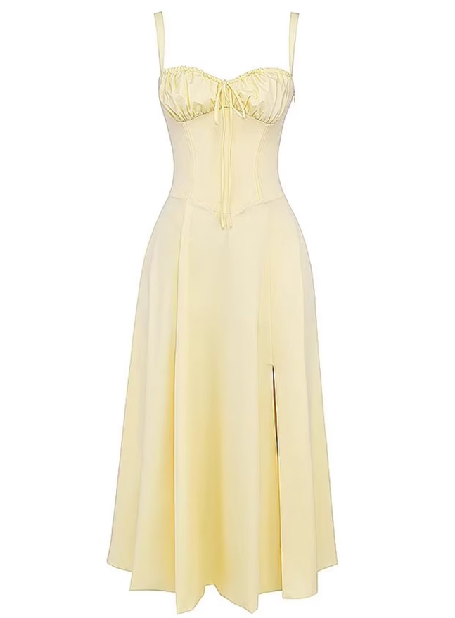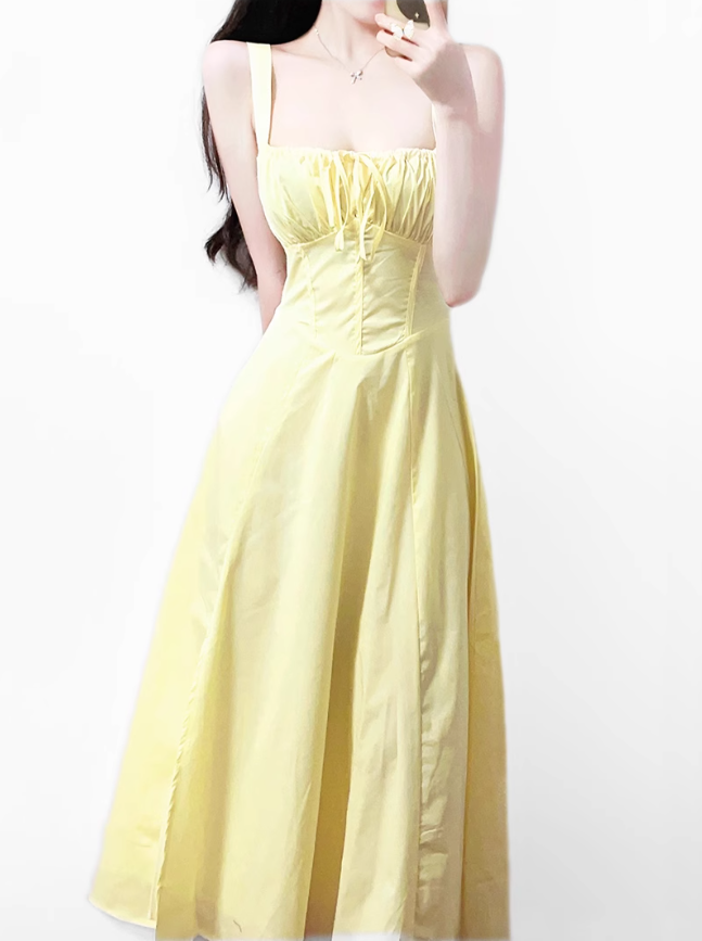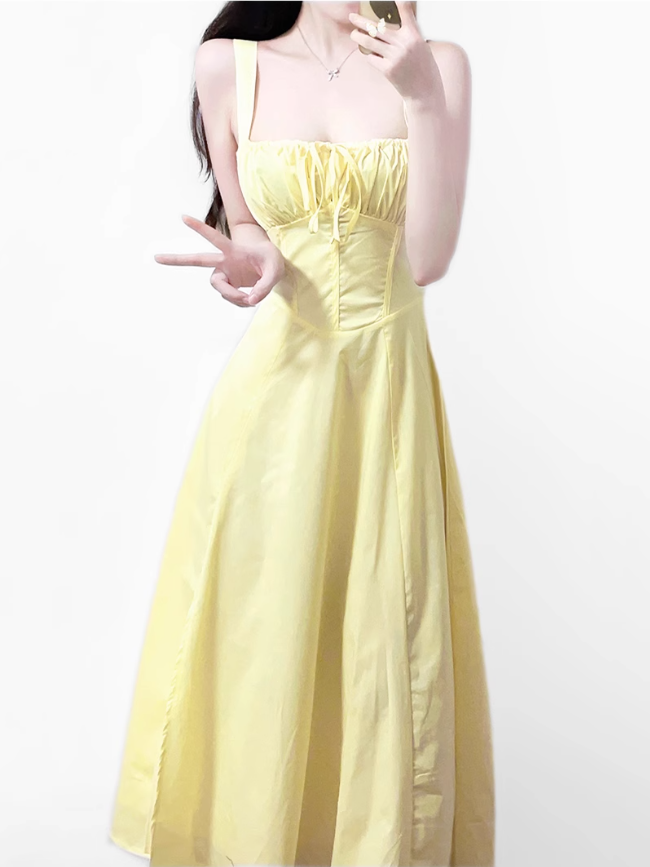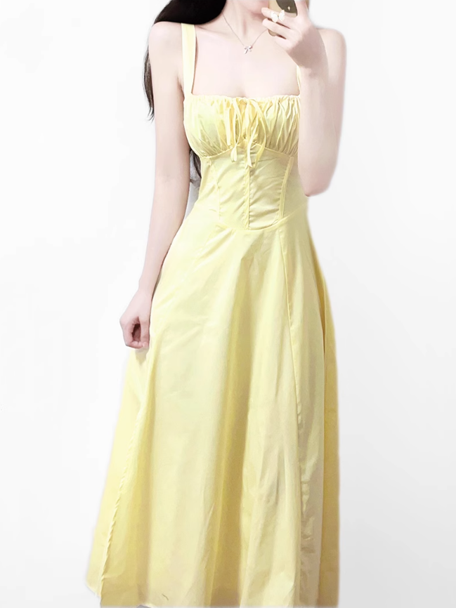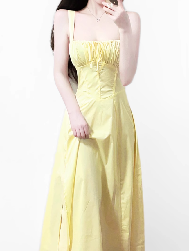 2025 Summer New Yellow Slit Sexy Waist Drawstring Holiday Suspender Dress R0938