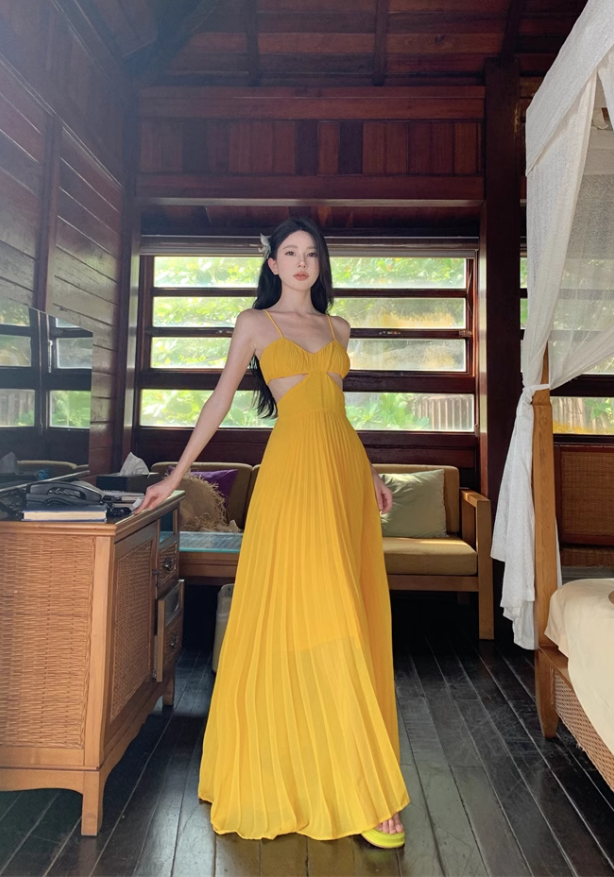 Beach resort long dress with a sense of atmosphere, slim waist and beautiful suspender dress R1577