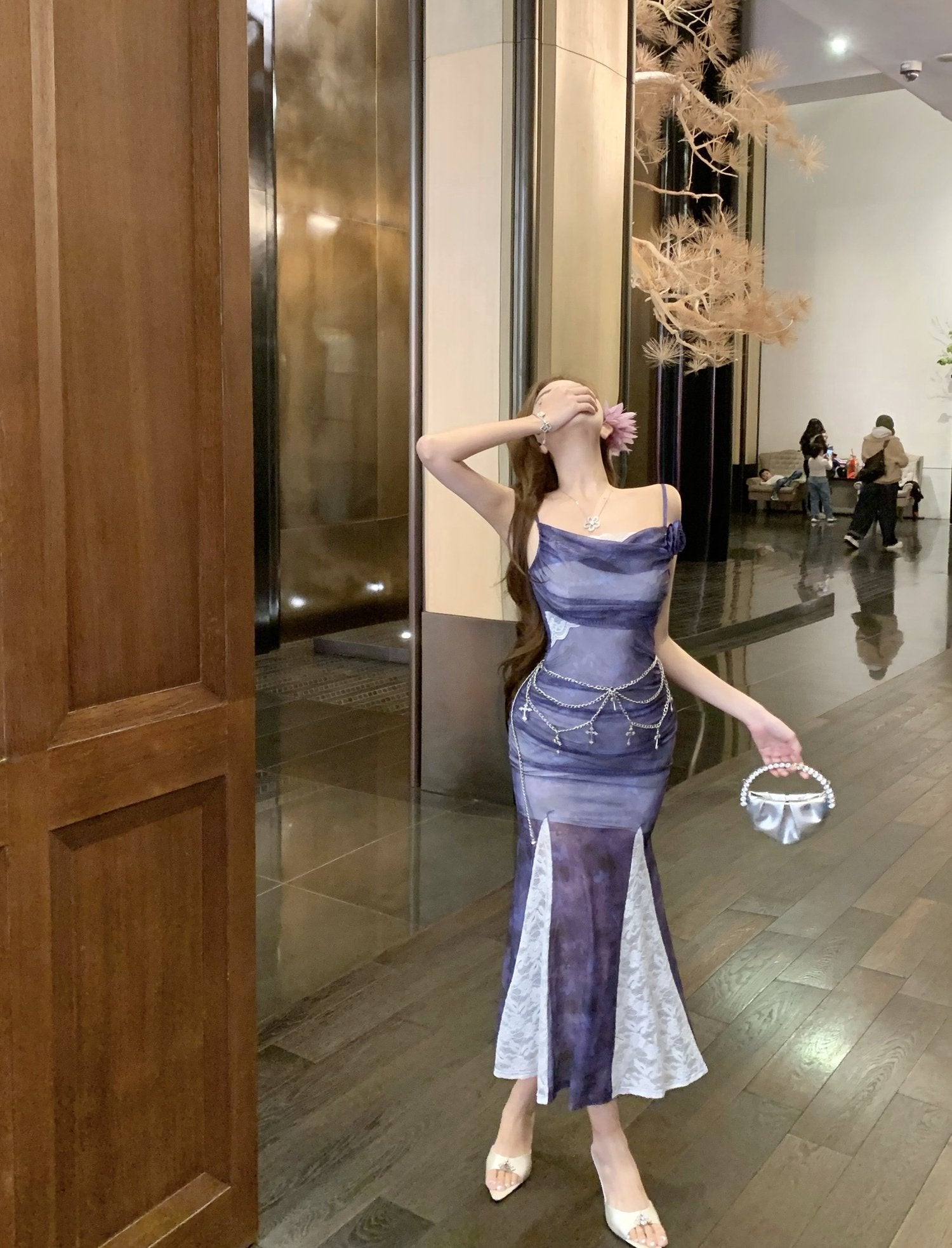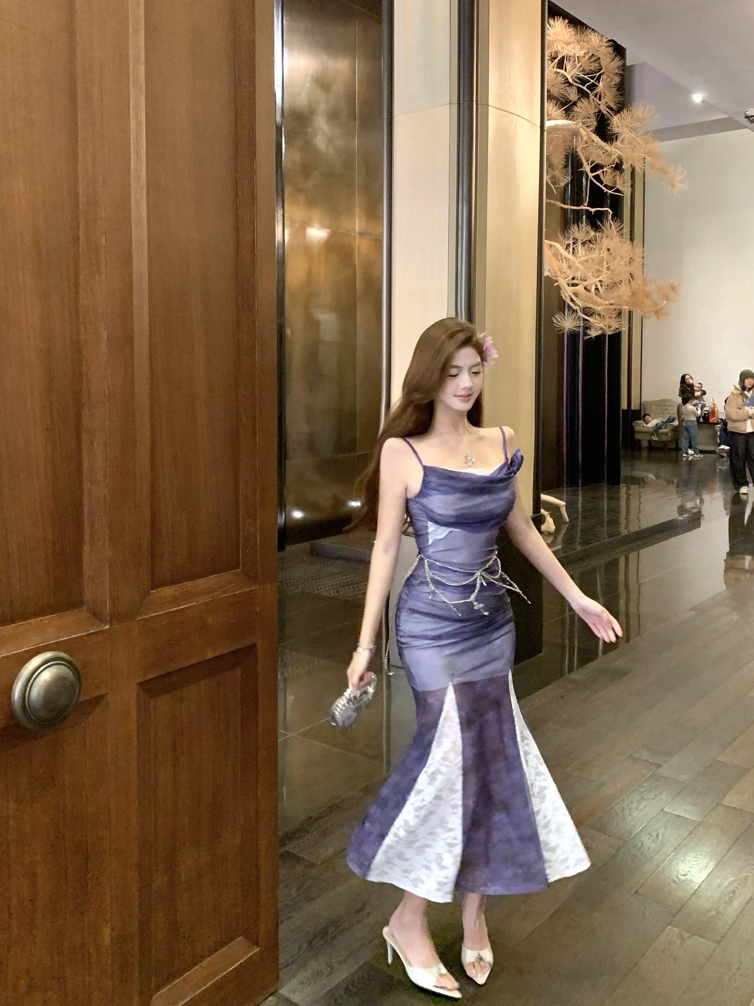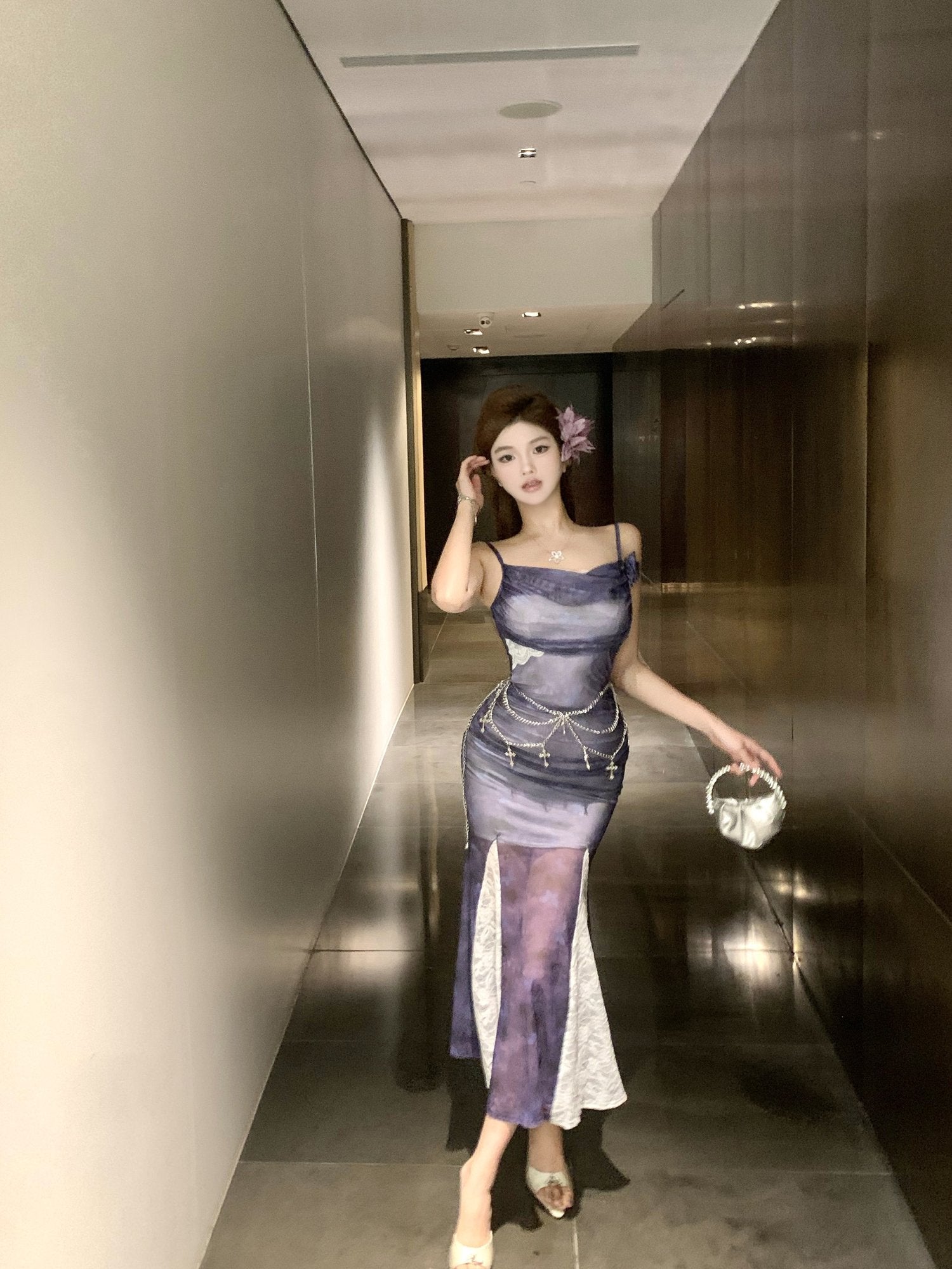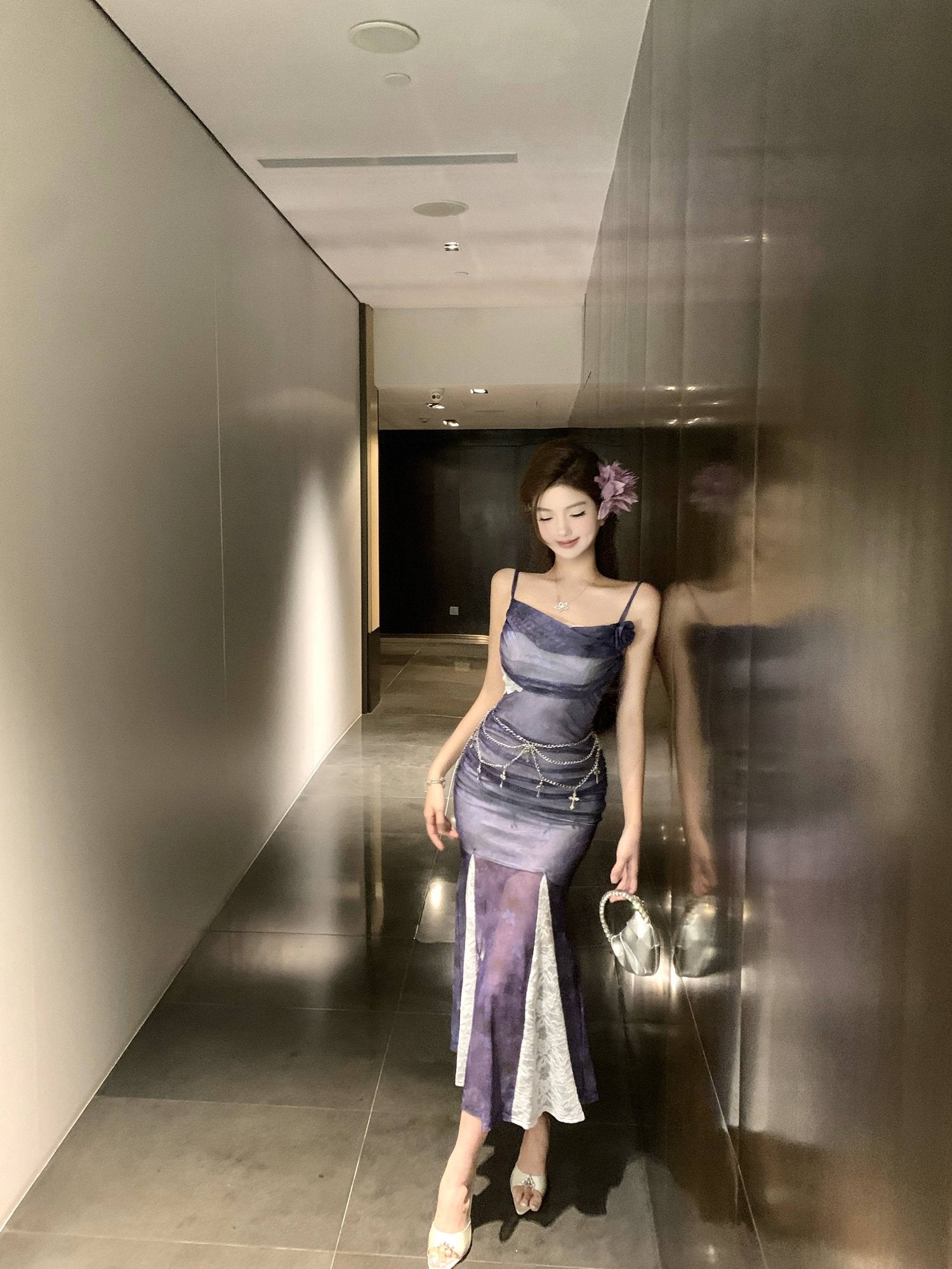 Beautiful small skirt waist hip skirt purple floral suspender dress R0635
