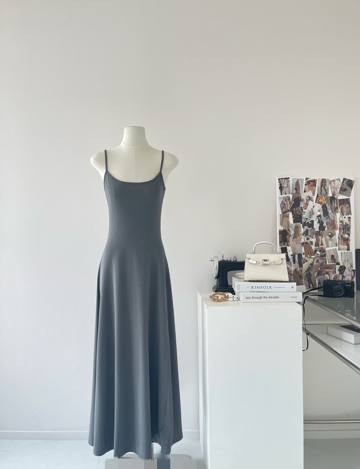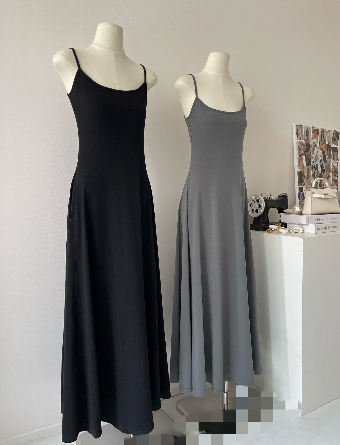 Black and gray simple waist slim U-neck temperament long suspender dress R2088