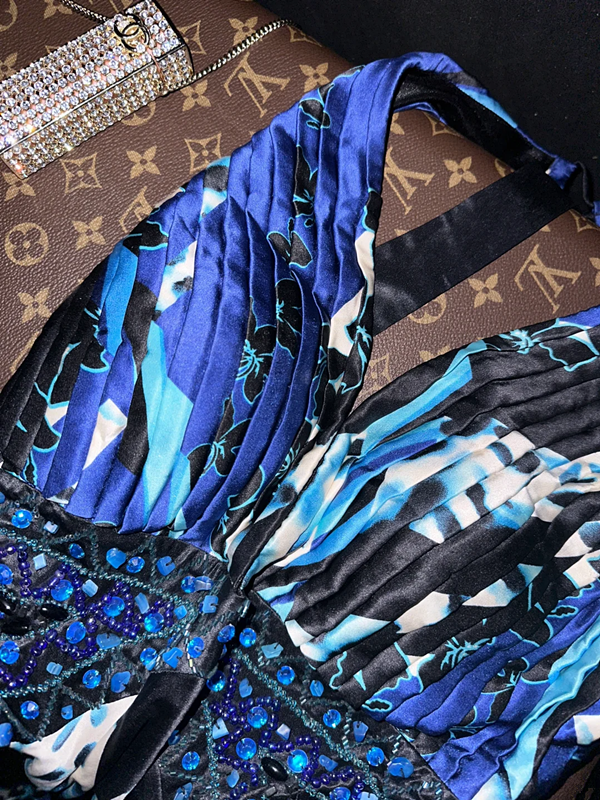 Blue halter neckline, sophisticated, fitted waist, elegant long ball gown R6947
