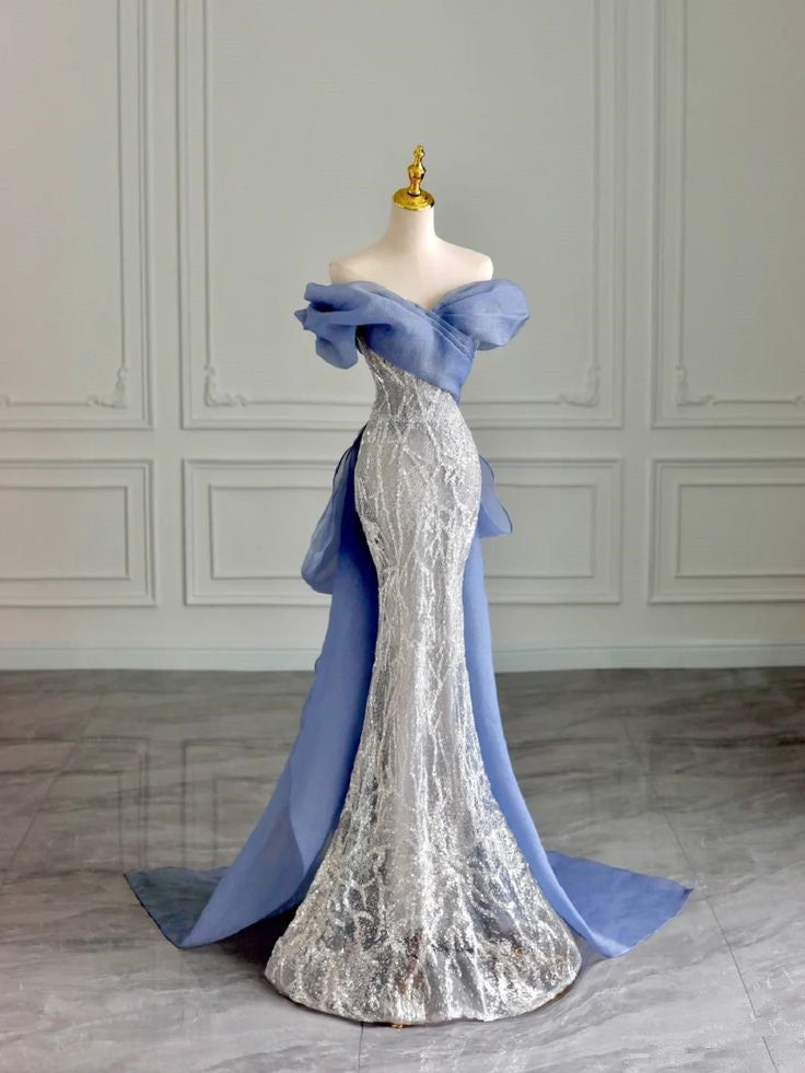 Blue one-shoulder tube top waist hip fishtail dress, prom dress R5619
