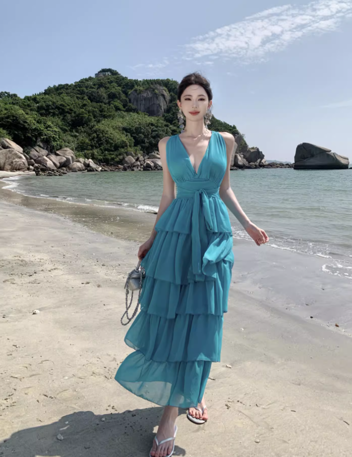 Blue seaside holiday long dress cake dress halter neck backless dress waist beach dress R1589