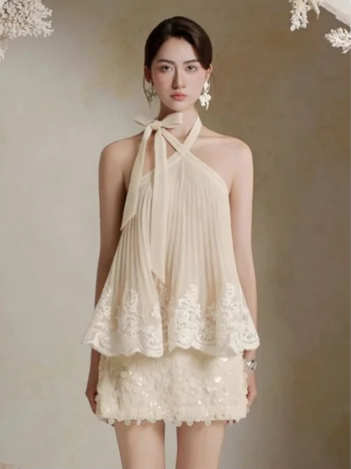 Brown Halter Neck Lace Top A-Line Sequined Skirt Homecoming Dress R4770