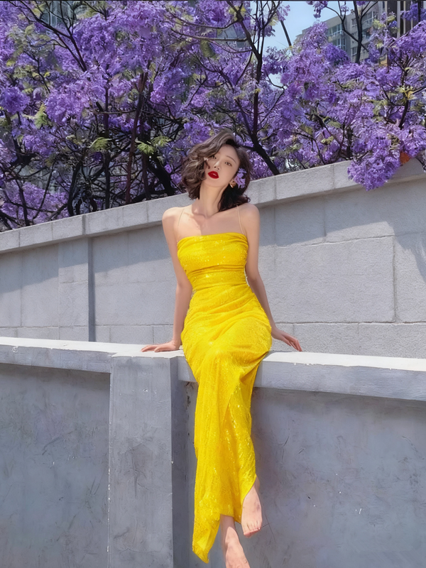 The dress is very sexy and charming, and the sequins on it look particularly beautiful in the sun.