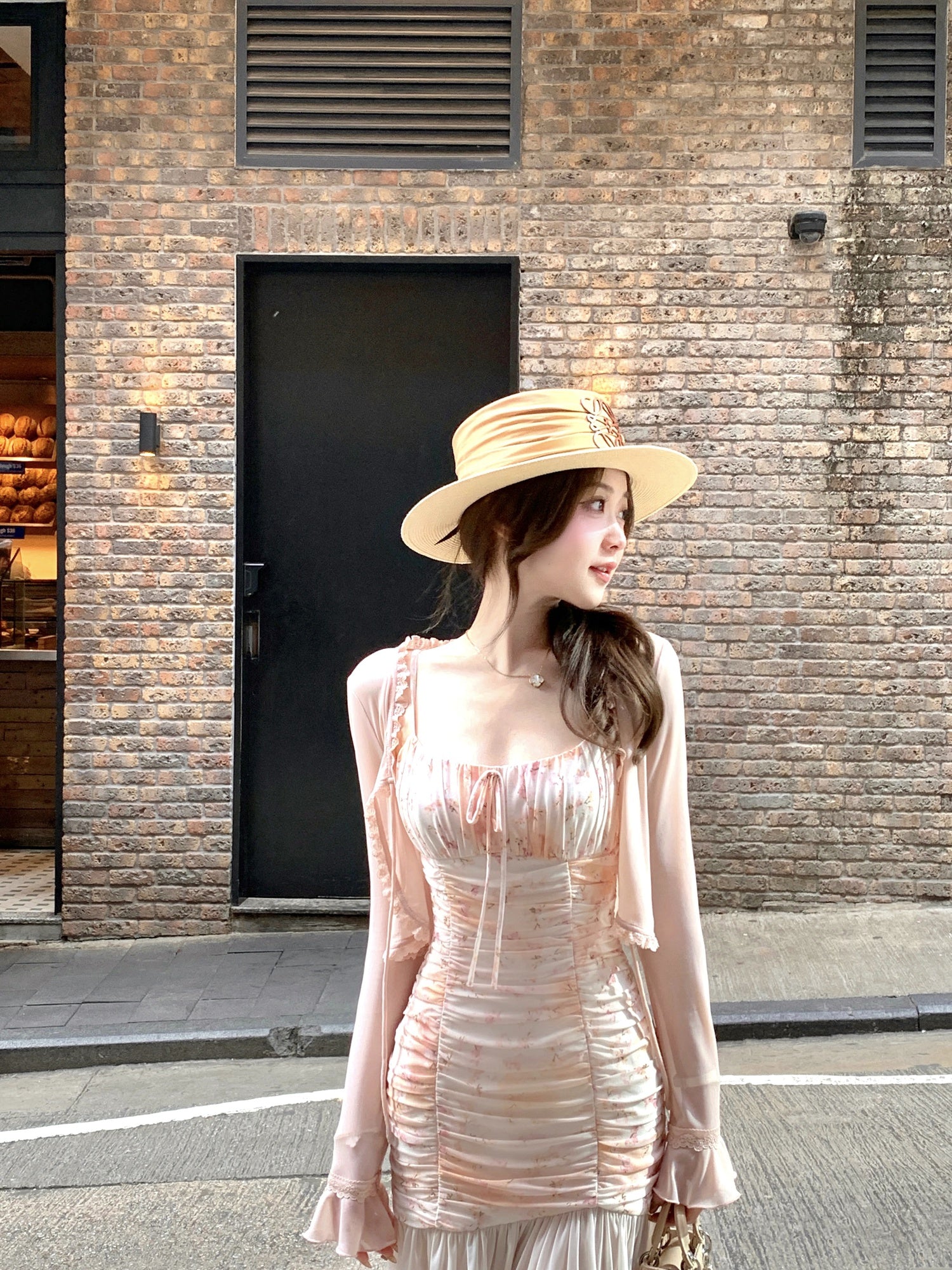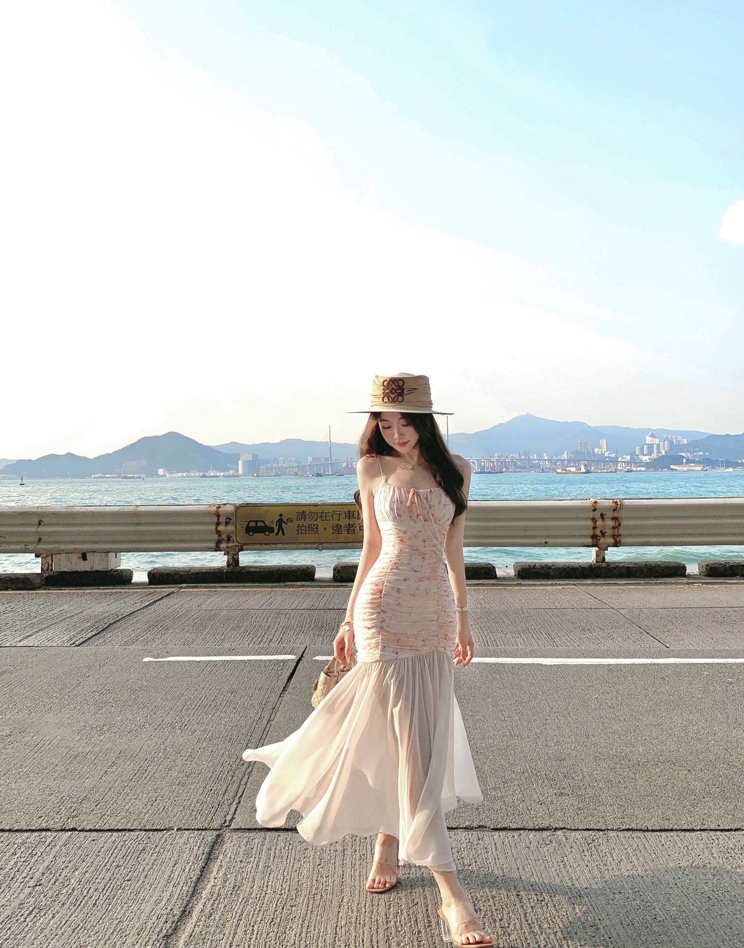 Design sense waist floral sling fishtail dress big swing gauze skirt long summer R3908
