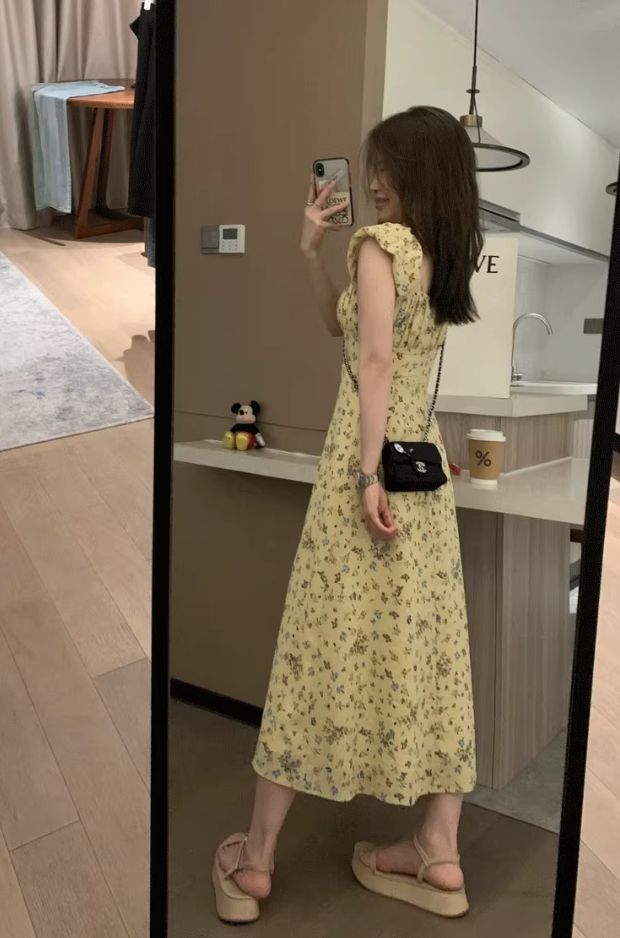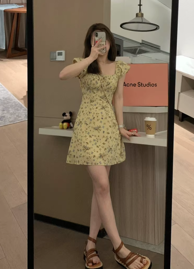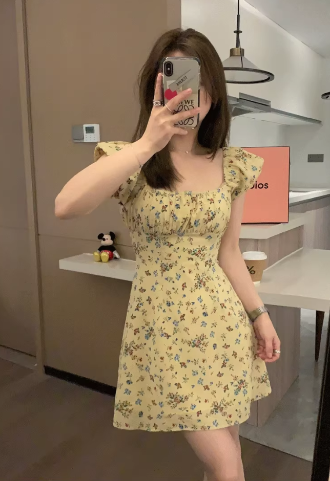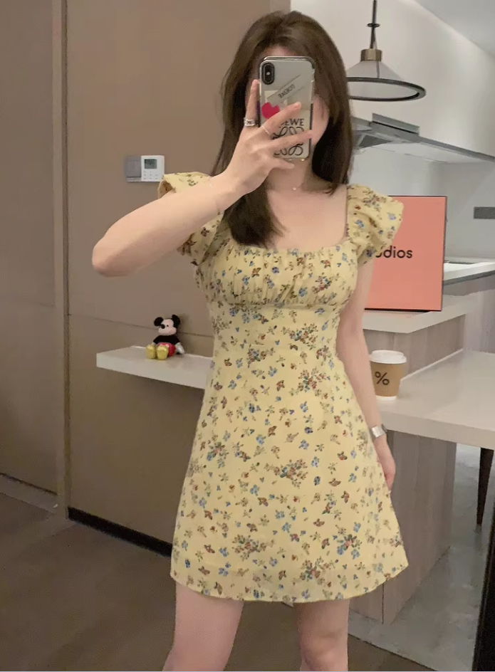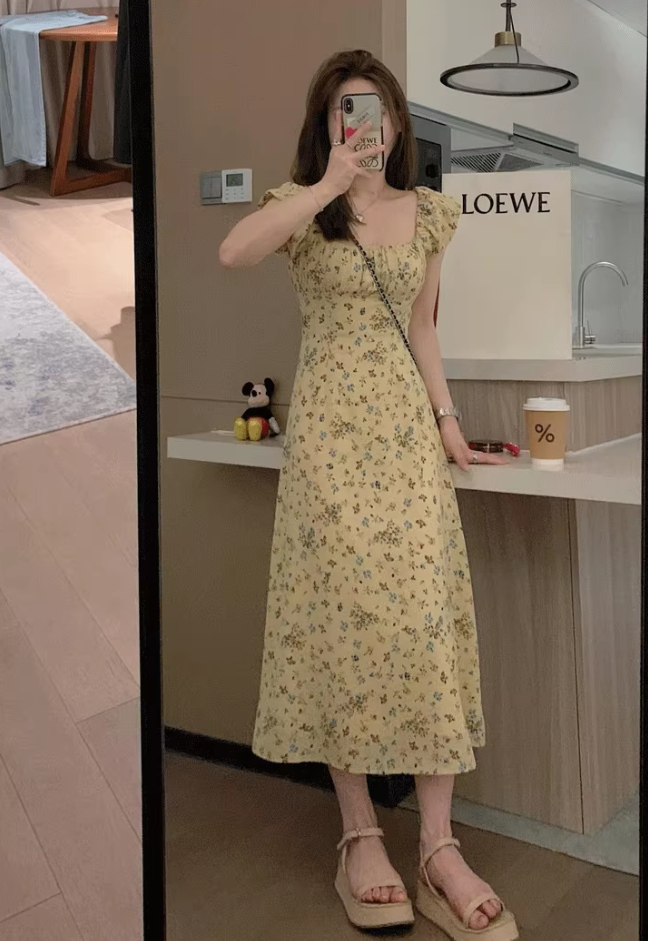 Dress long French style slim fit square collar flying sleeves A-line short skirt summer R2932