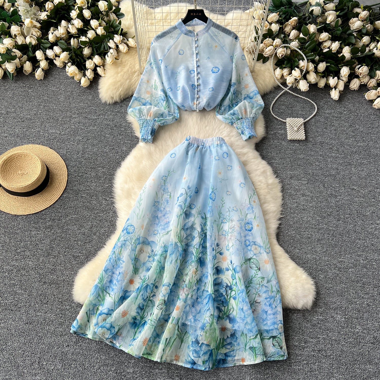 European and American style two-piece lantern sleeve button-down top high waist printed mesh skirt R2314