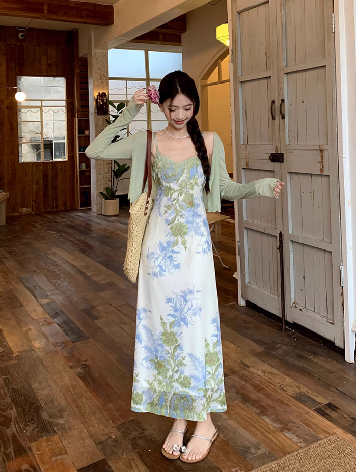 Fairy New Chinese Retro Jacquard Suspender Skirt Flower Long Skirt Tea Break Dress R1759