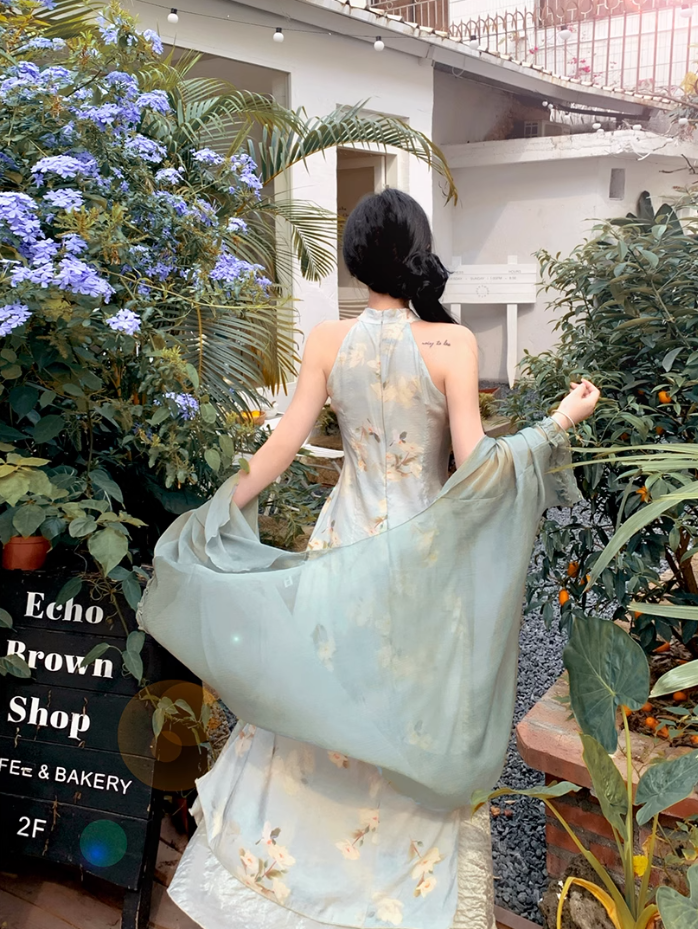 Fairy New Chinese Retro Temperament Splicing Printed Long Skirt Sleeveless Halter Neck Dress R1711