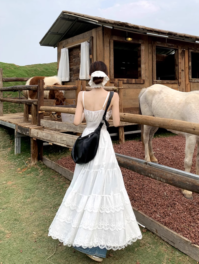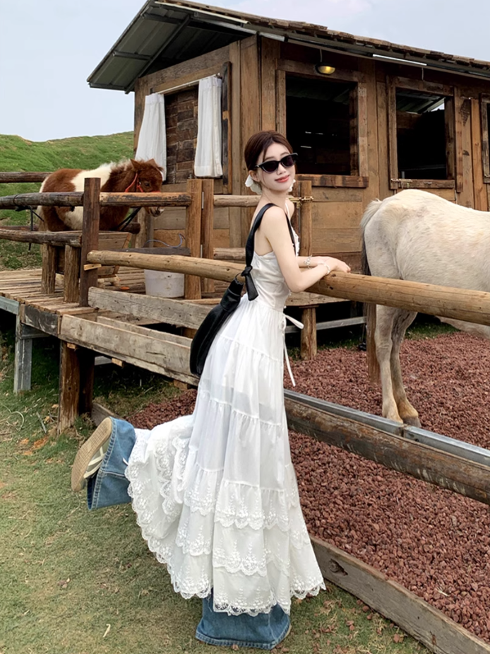 Fairy white Dingdal skirt waist skirt lace splicing slit suspender dress R1755