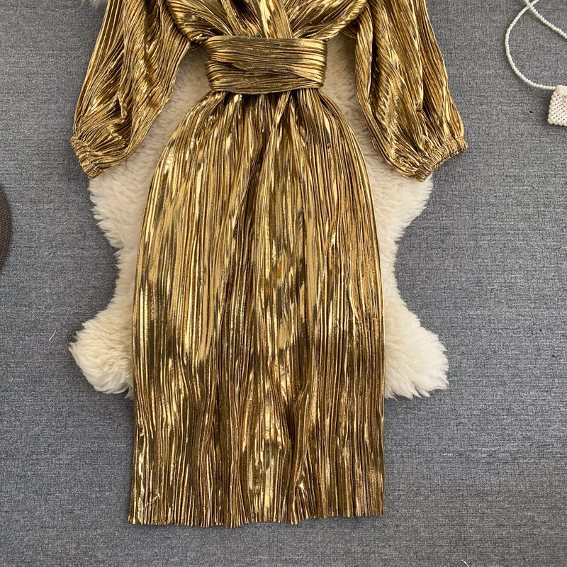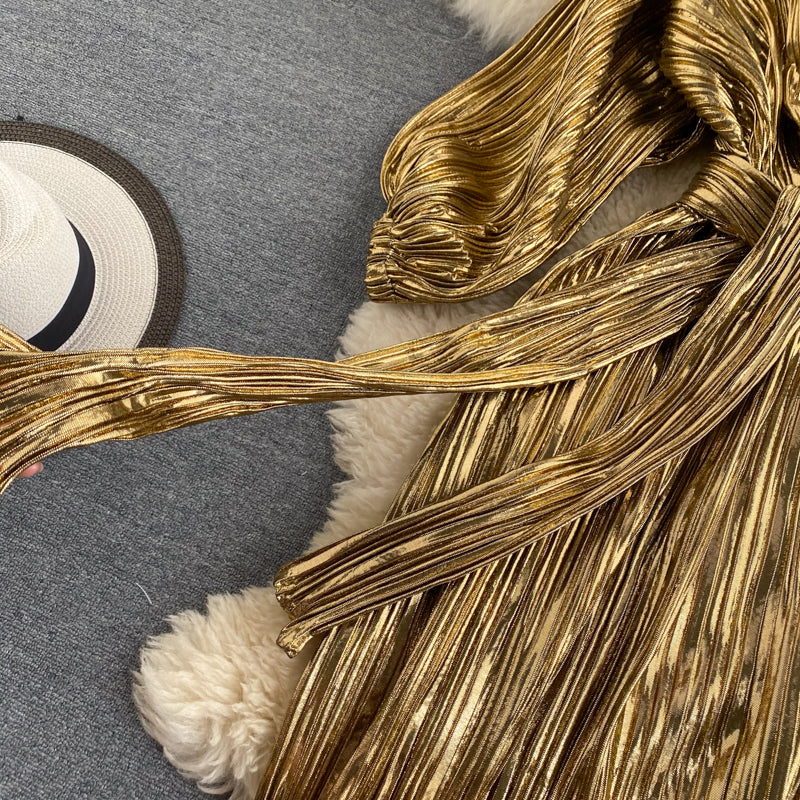 Fashion blogger retro palace style dress new temperament V-neck tie waist dress R2199