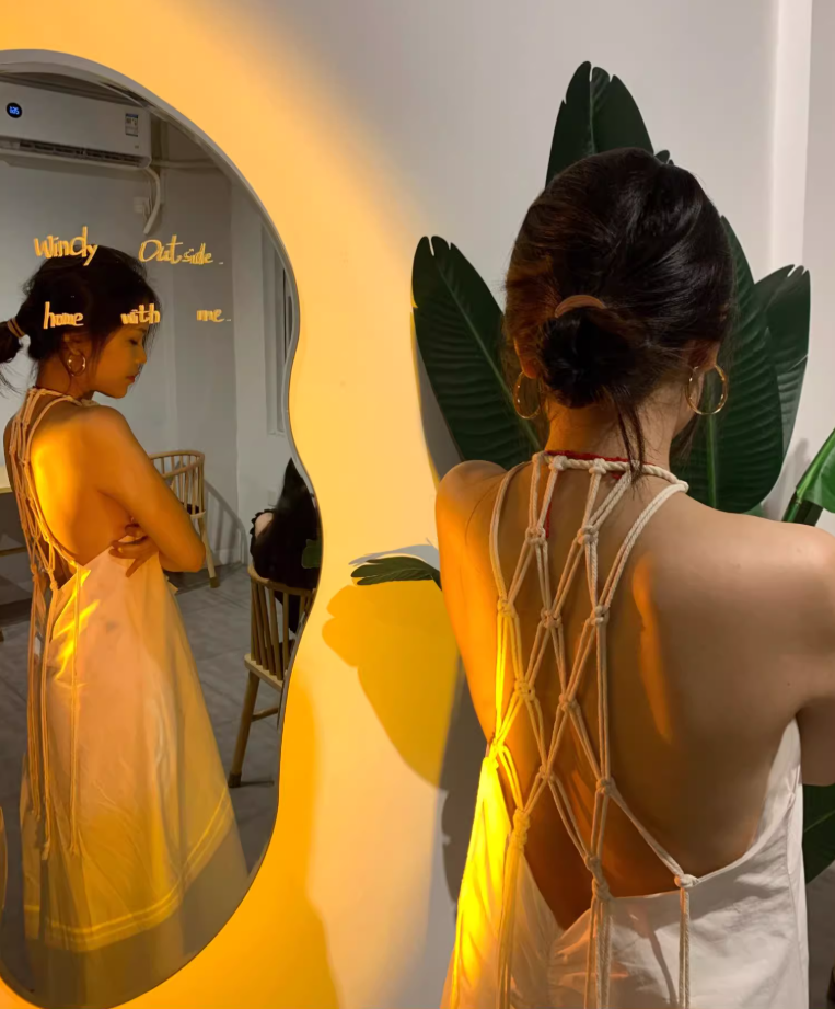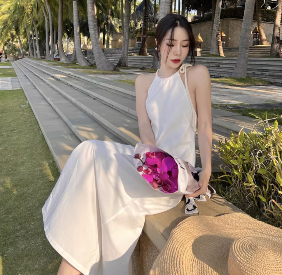 French backless white dress design niche slim sexy seaside holiday beach dress R1602