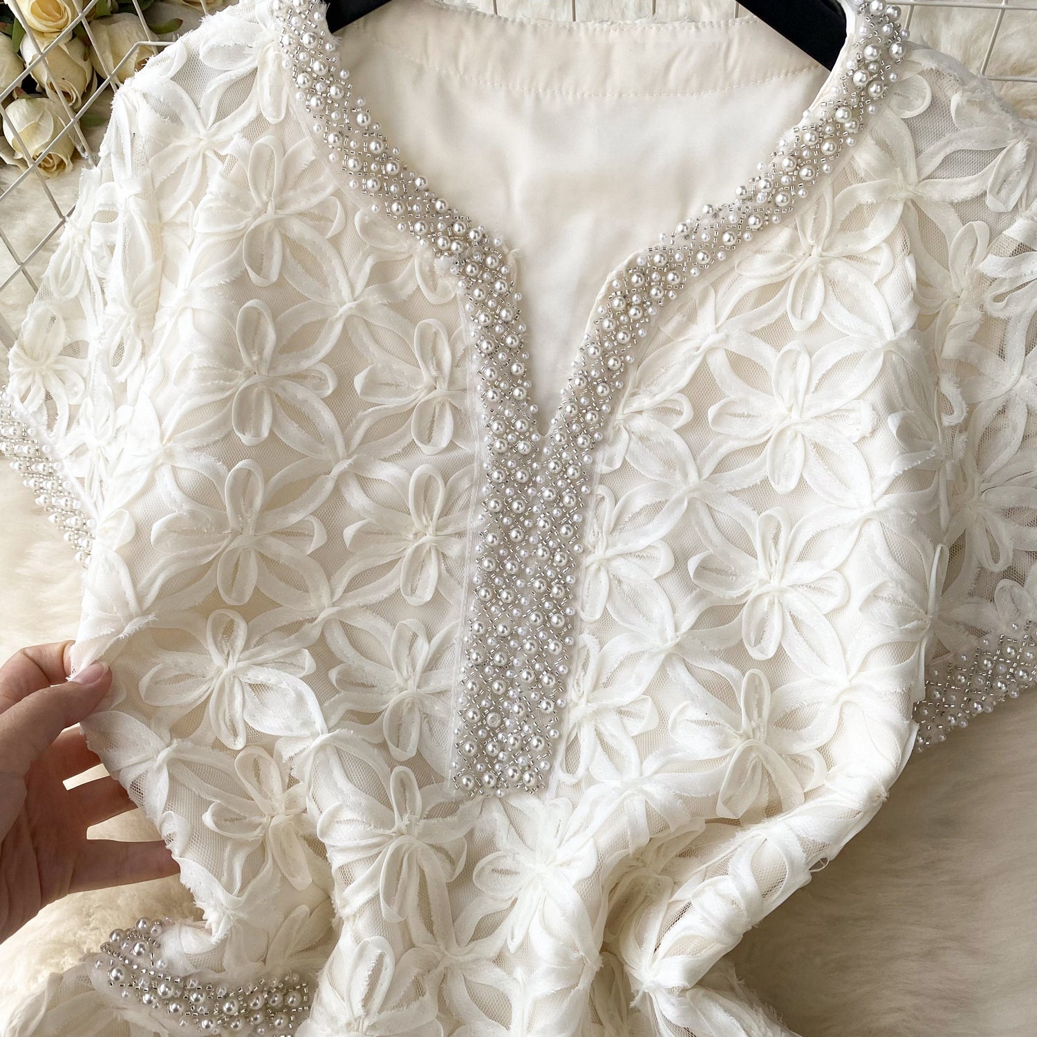 French beaded lace hook flower short sleeve dress high waist slim temperament short skirt R2276