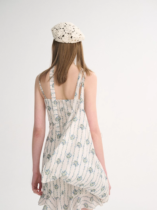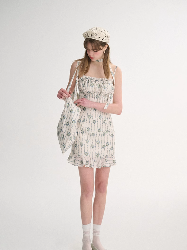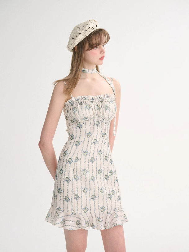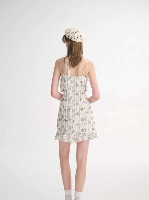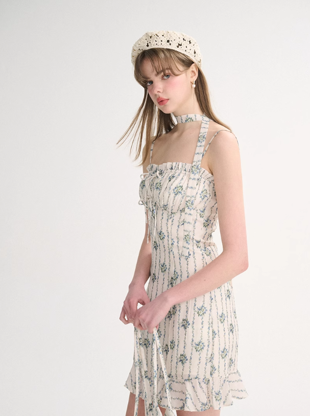French halter neck suspender skirt ruffled floral skirt holiday style dress R2752