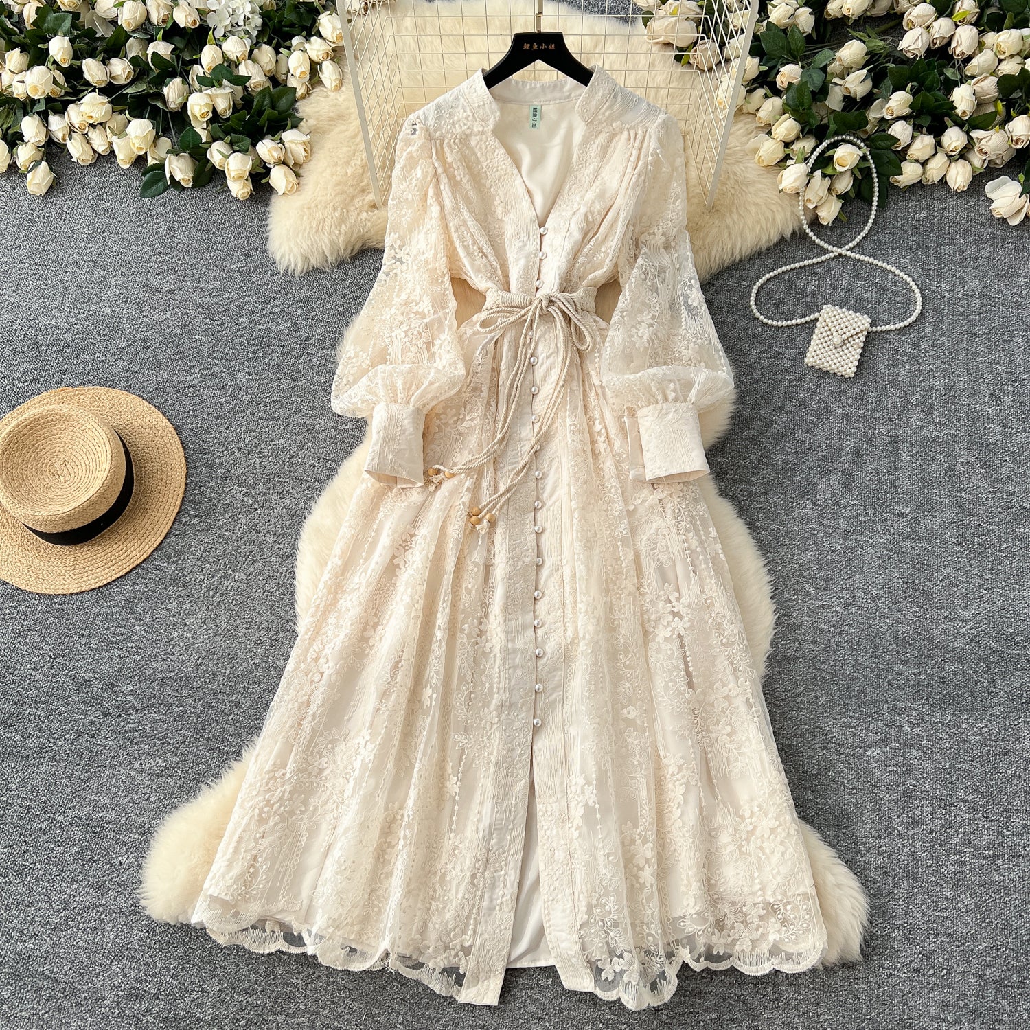 French high-end dress 2025 waist embroidery V-neck lantern sleeves single-breasted long skirt R2135
