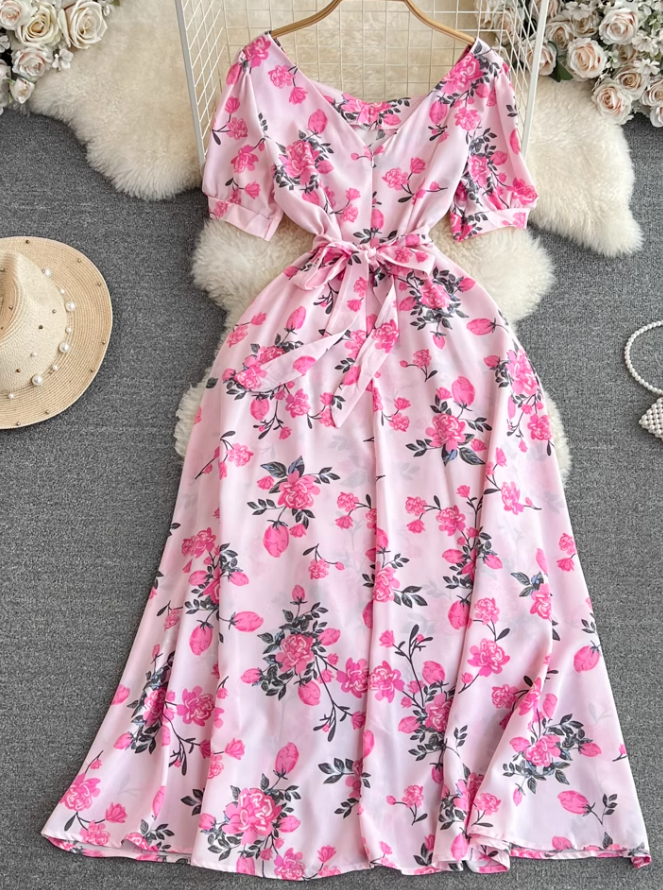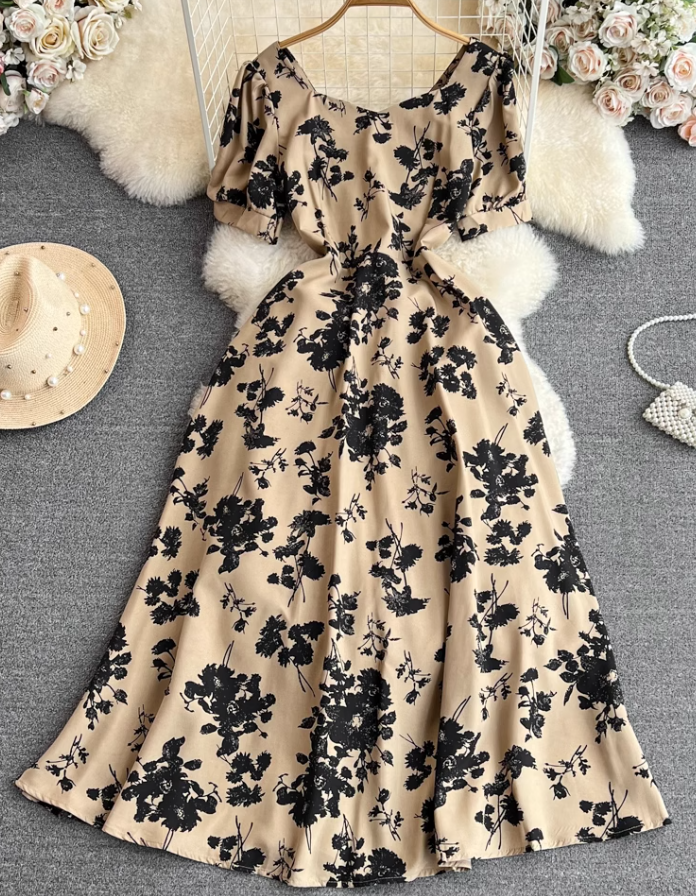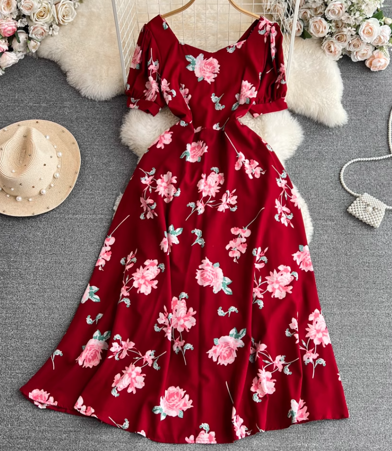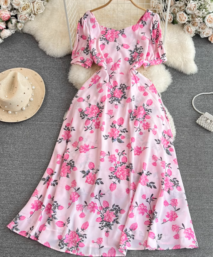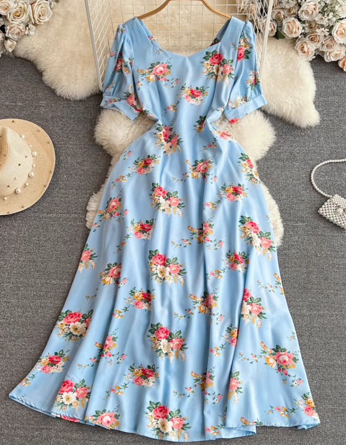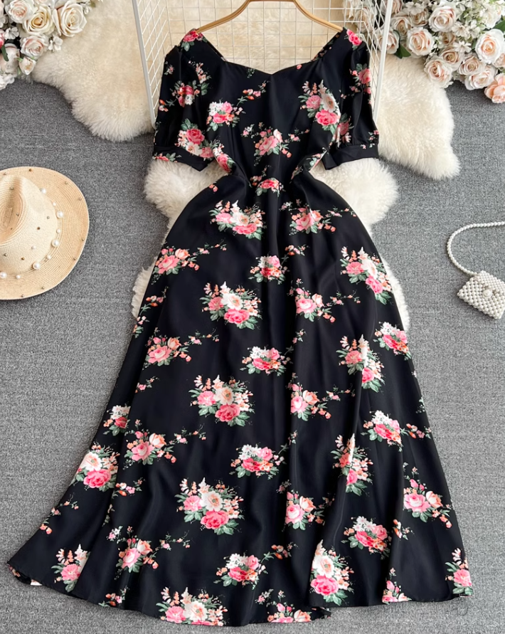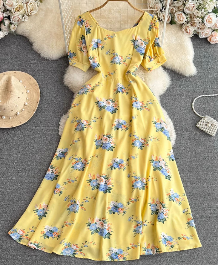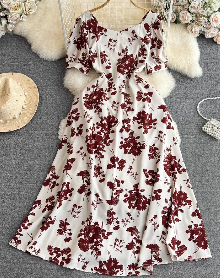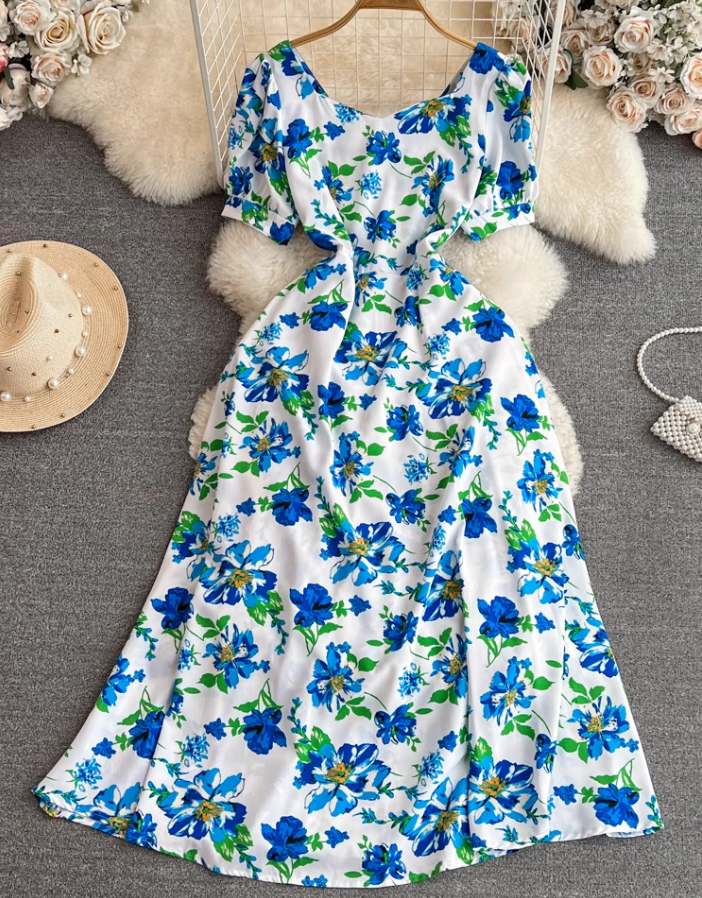 French lady temperament lady short sleeve square collar waist slim a-line print dress elegant long skirt R0406