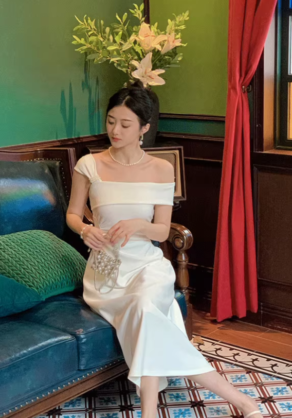 French one-shoulder dress 2025 sexy temperament waist elegant party dress R1488