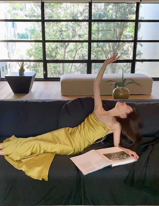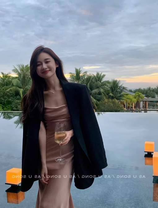 French silk satin suspender dress with backless vacation outfit fishtail slit inner long skirt R1531