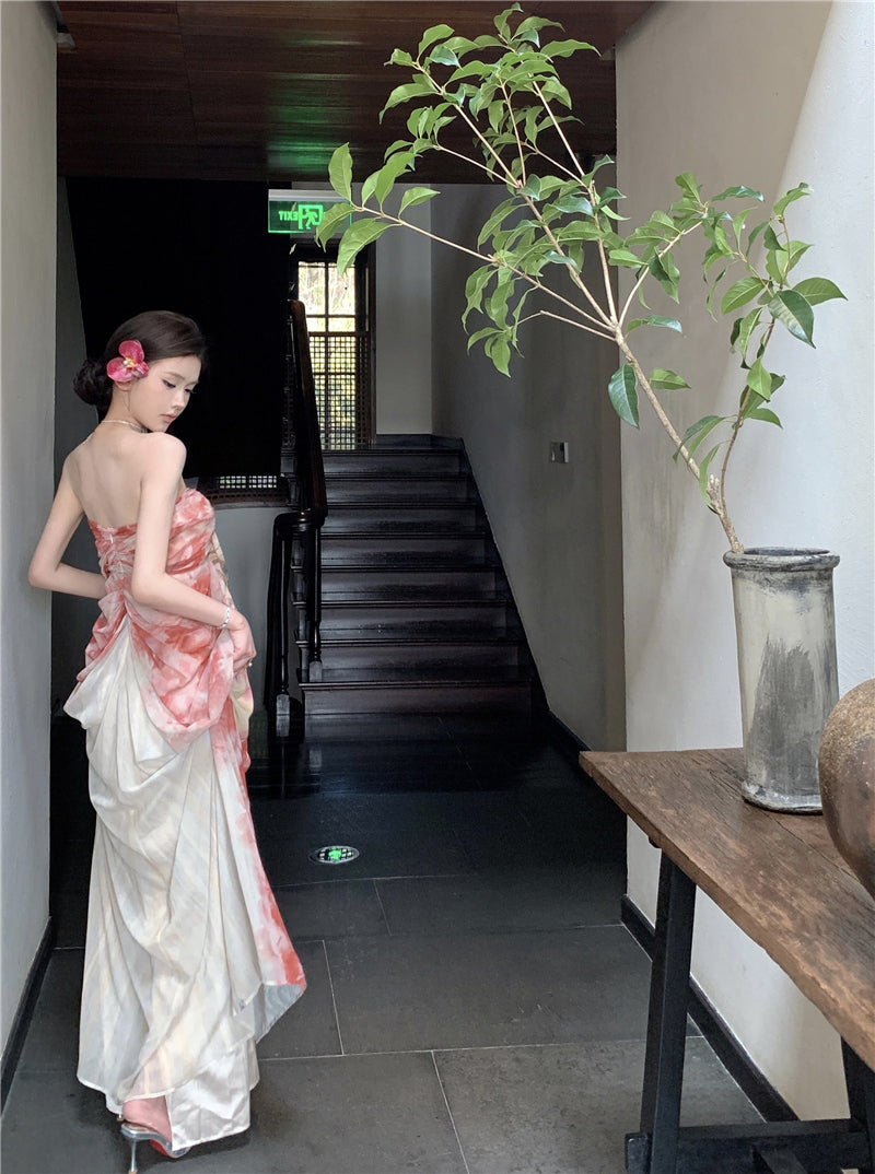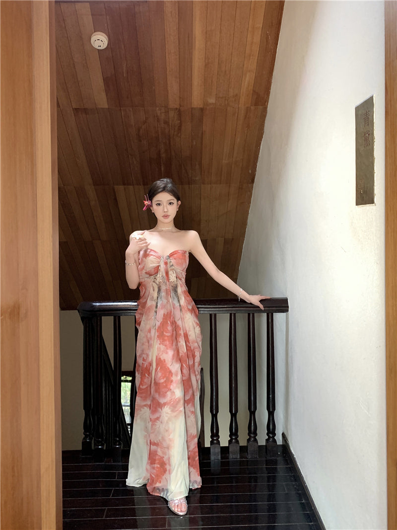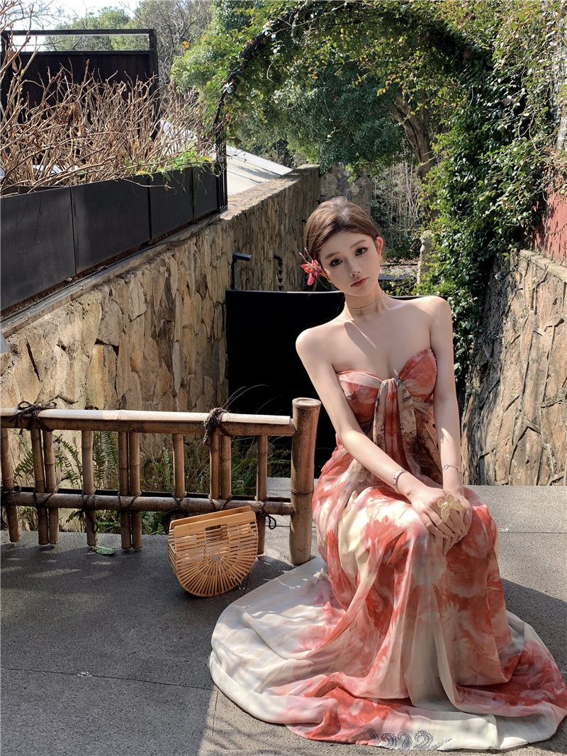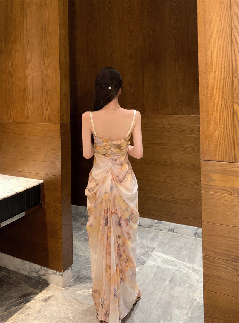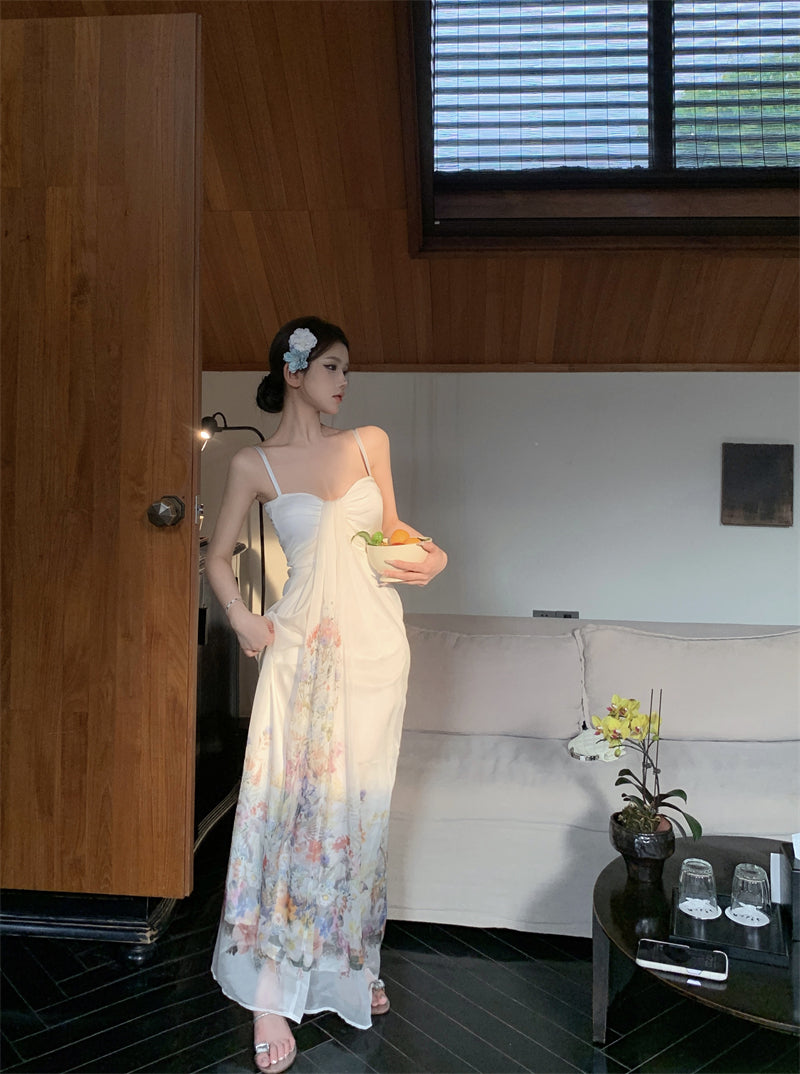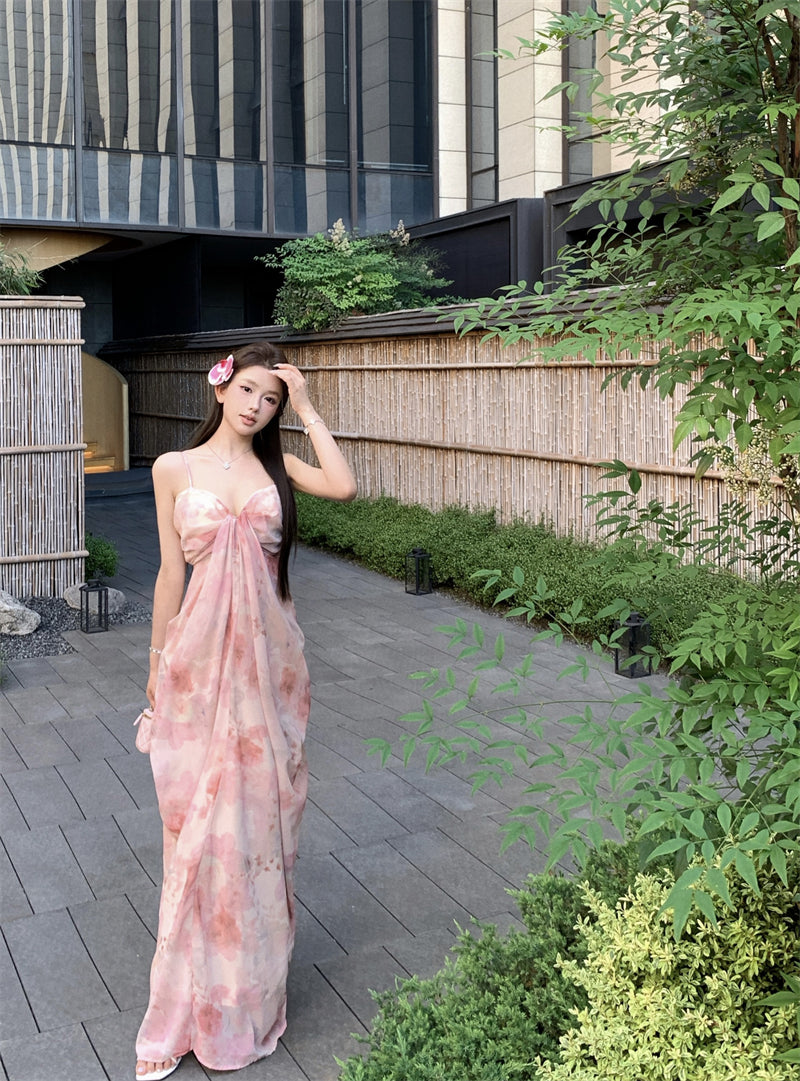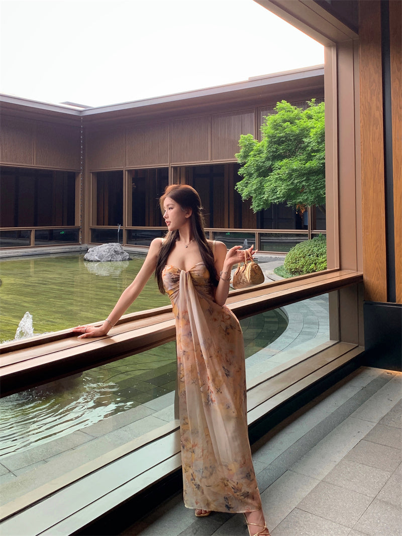 French style beautiful sling dress seaside holiday green print dress beach dress R1564