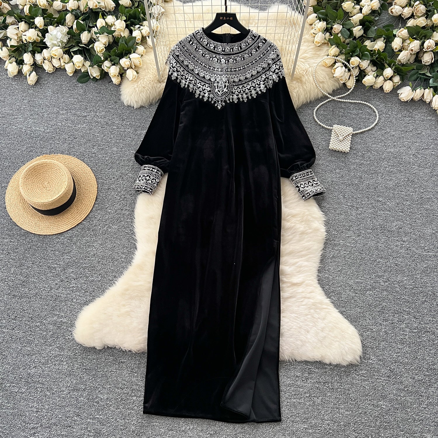 French style sequined beaded round neck long sleeve velvet dress loose slim slit long skirt R2235