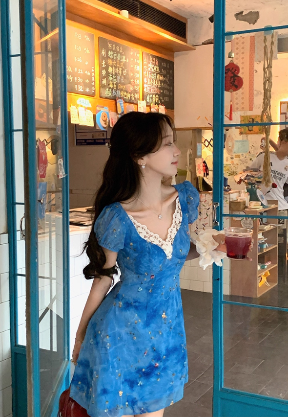 French V-neck blue floral dress women's summer retro sleeveless short skirt R4303