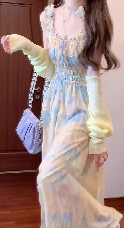 Gentle floral suspender dress holiday style beautiful waist A-line long skirt R0688
