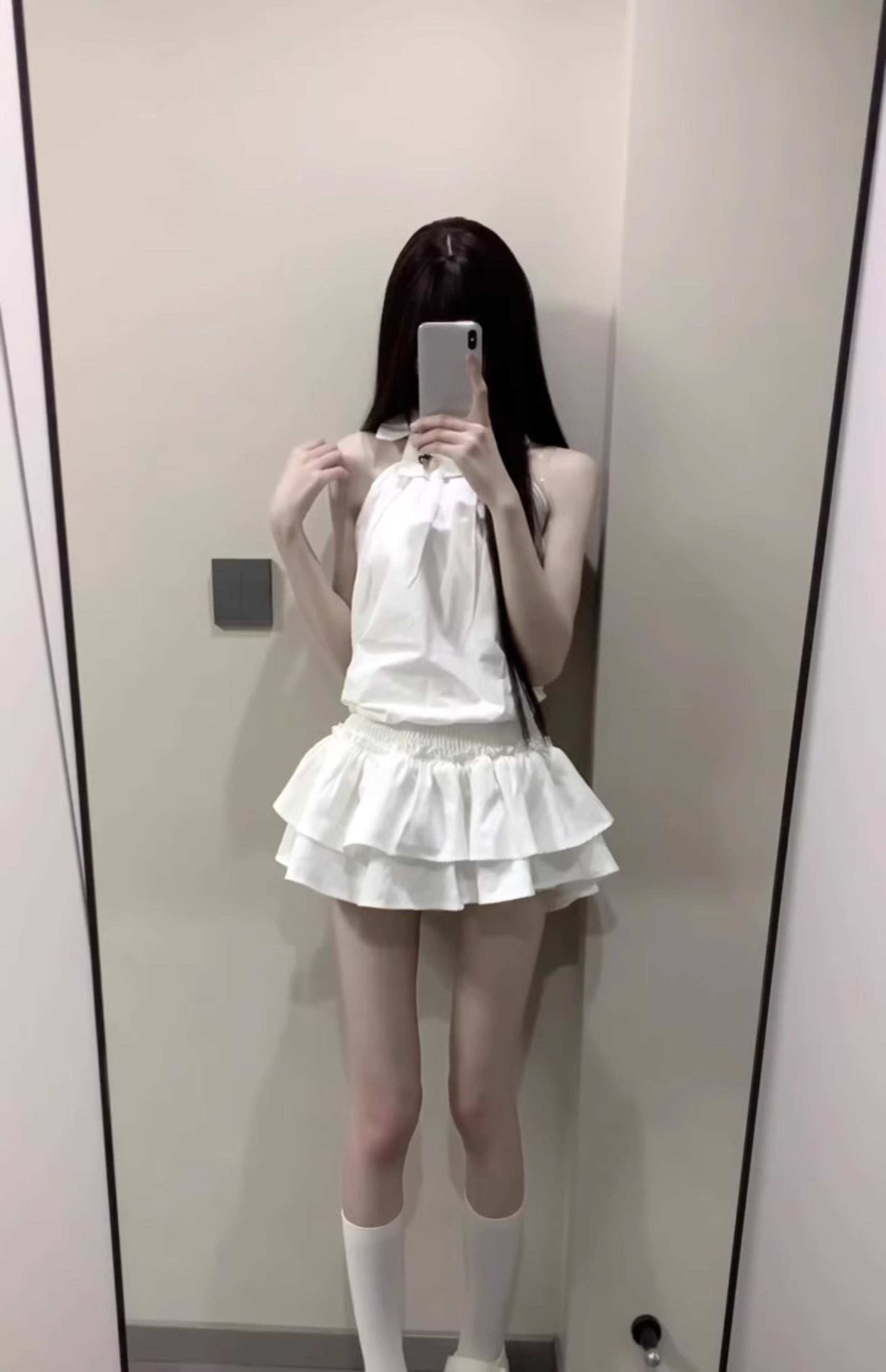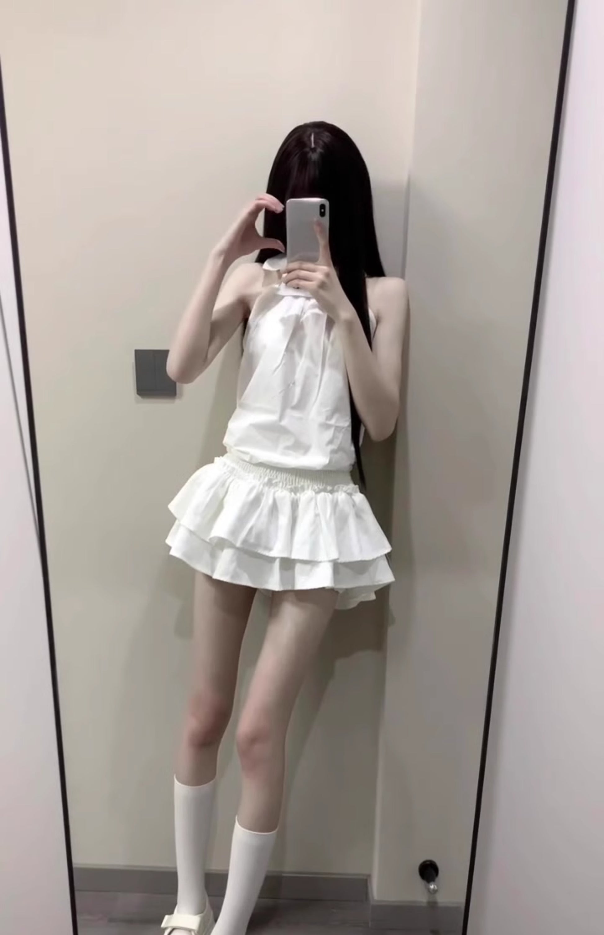 Gentle temperament beautiful white halter neck top puffy skirt two-piece set R0842