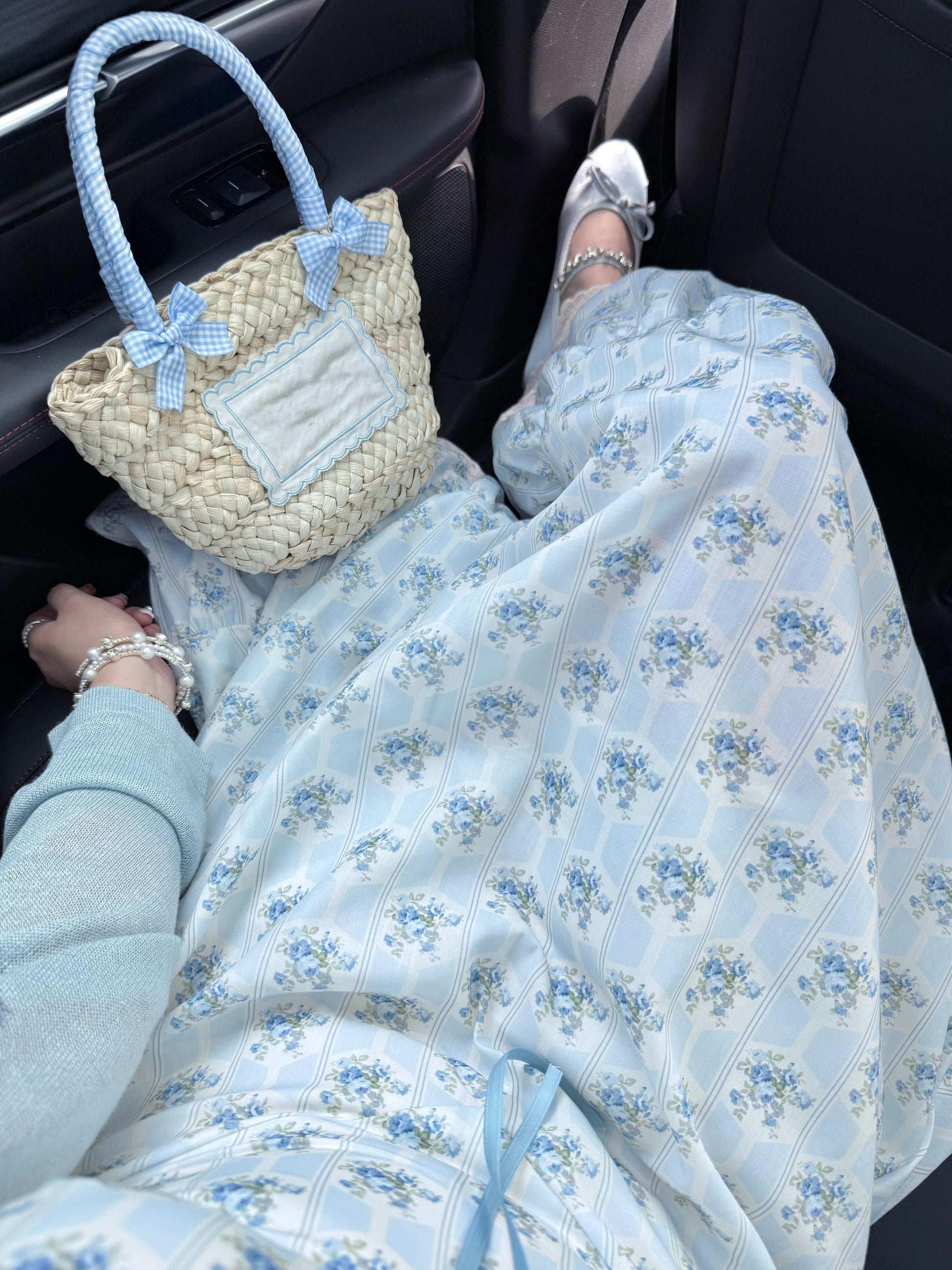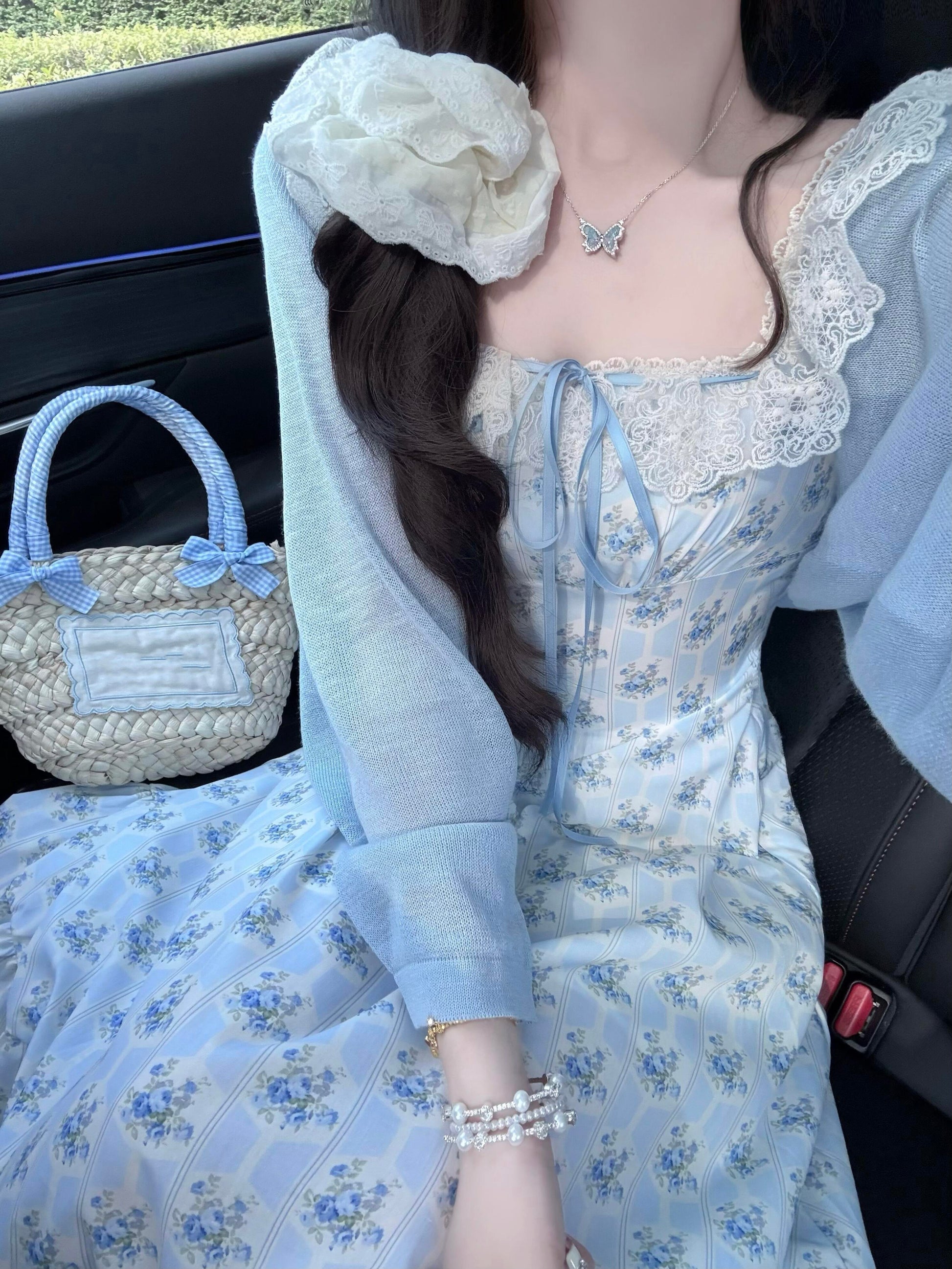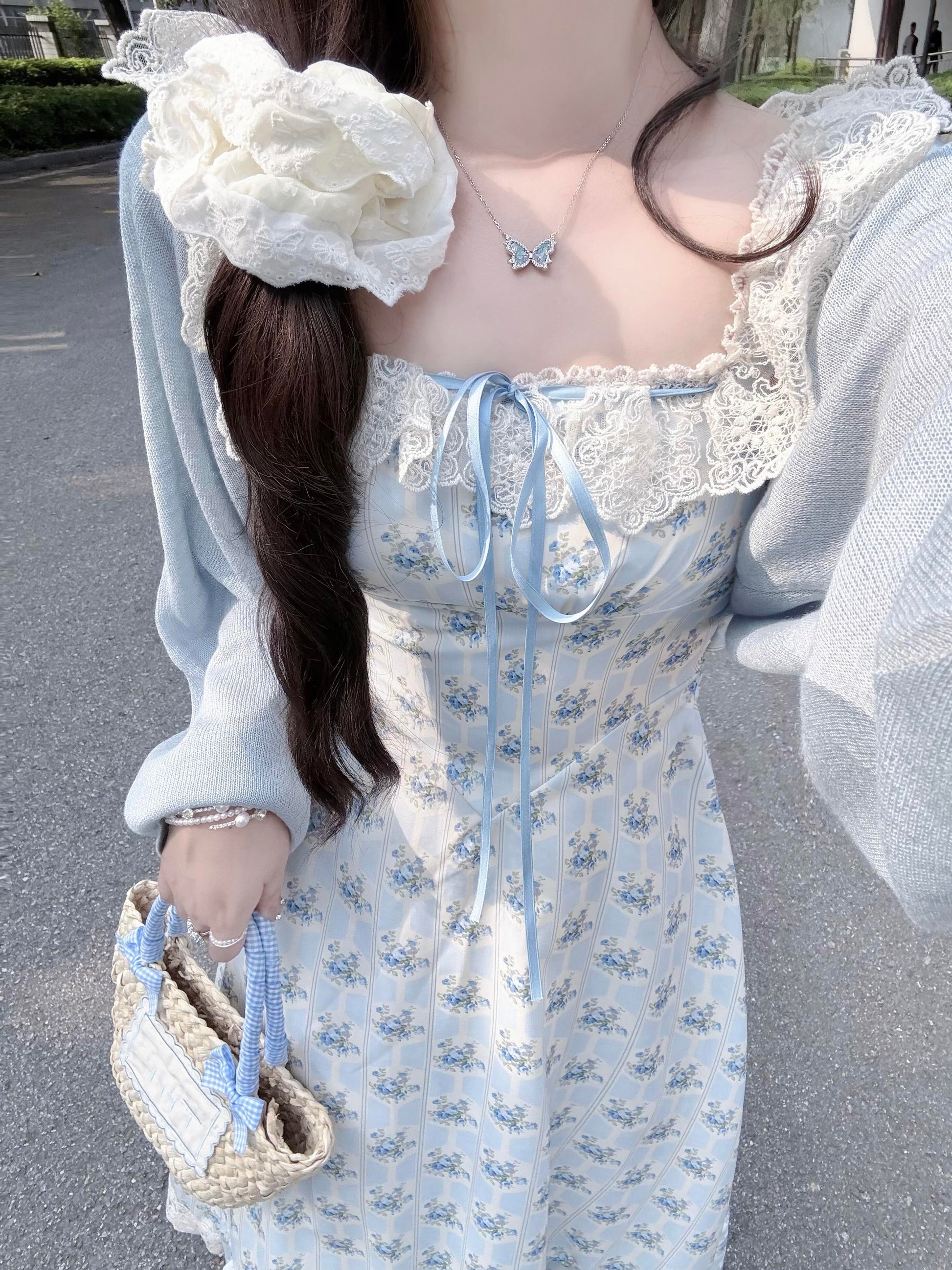 Gentle temperament blue floral dress new style beautiful small skirt R0684