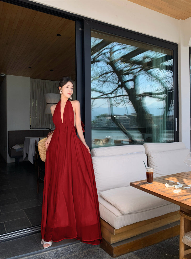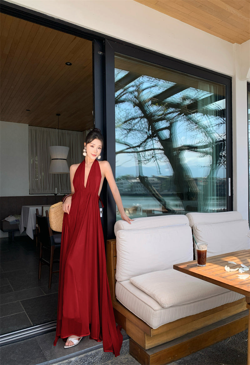 Gentle temperament V-neck halter dress unique waist A-line beach dress R0576