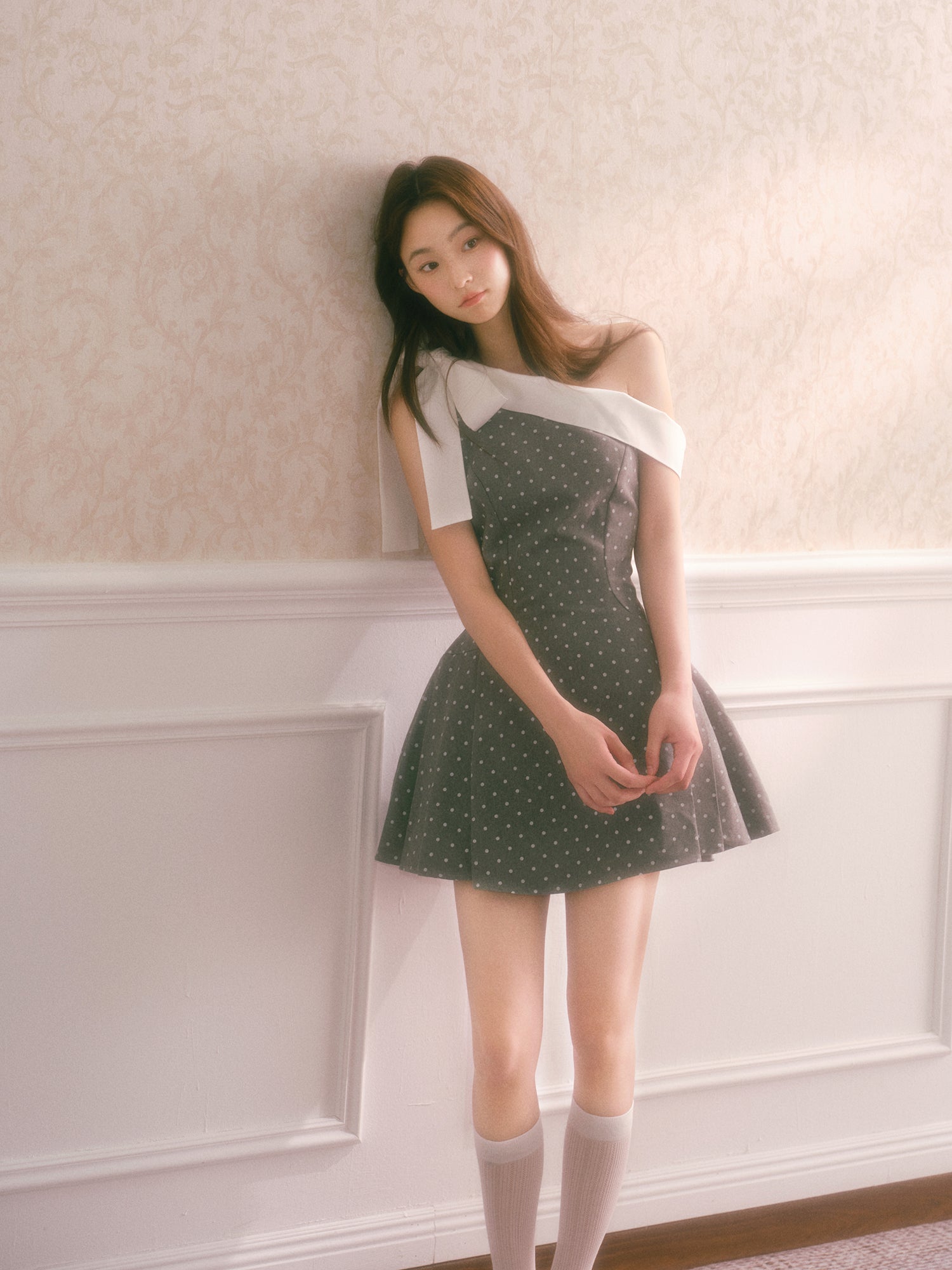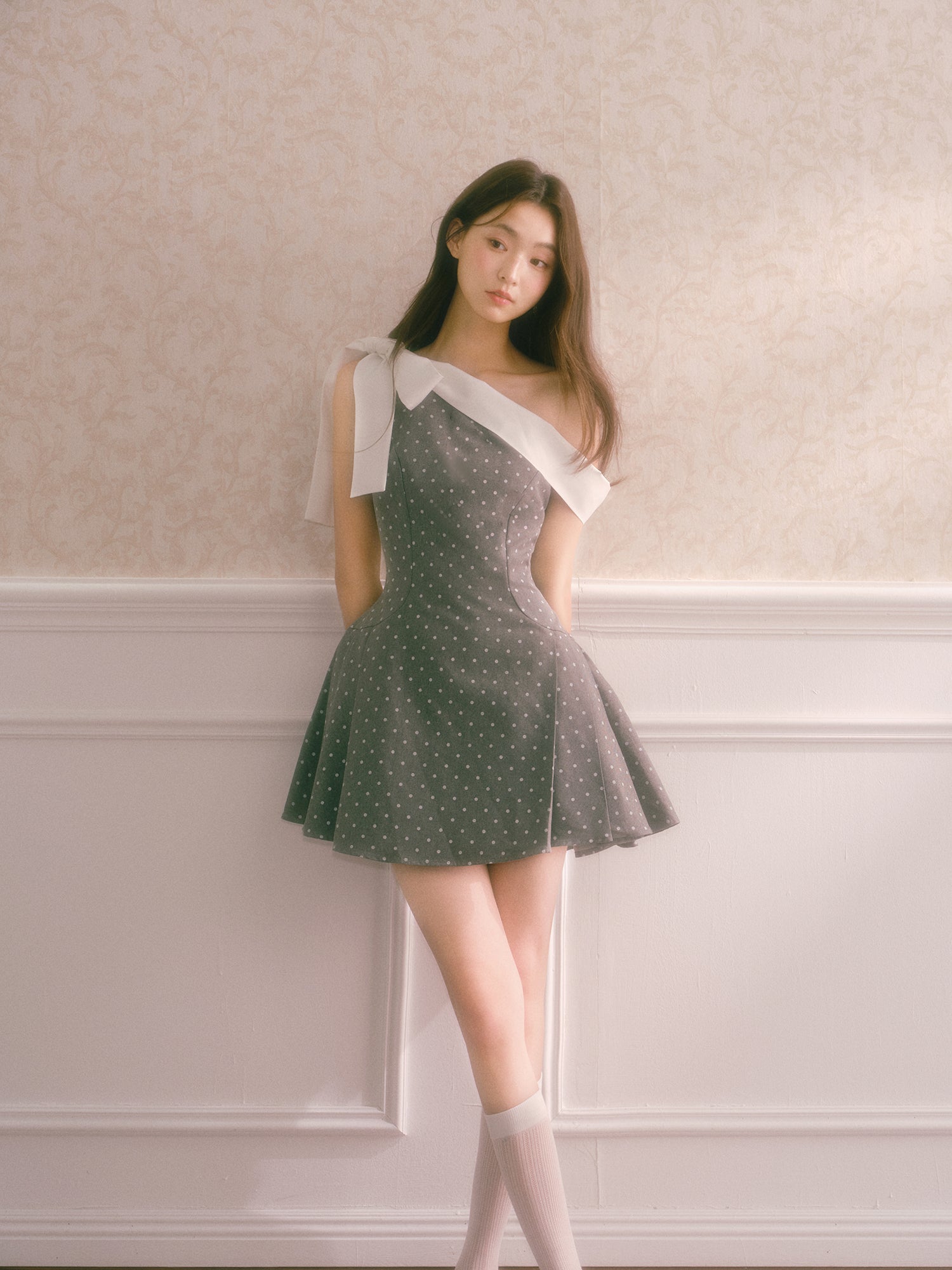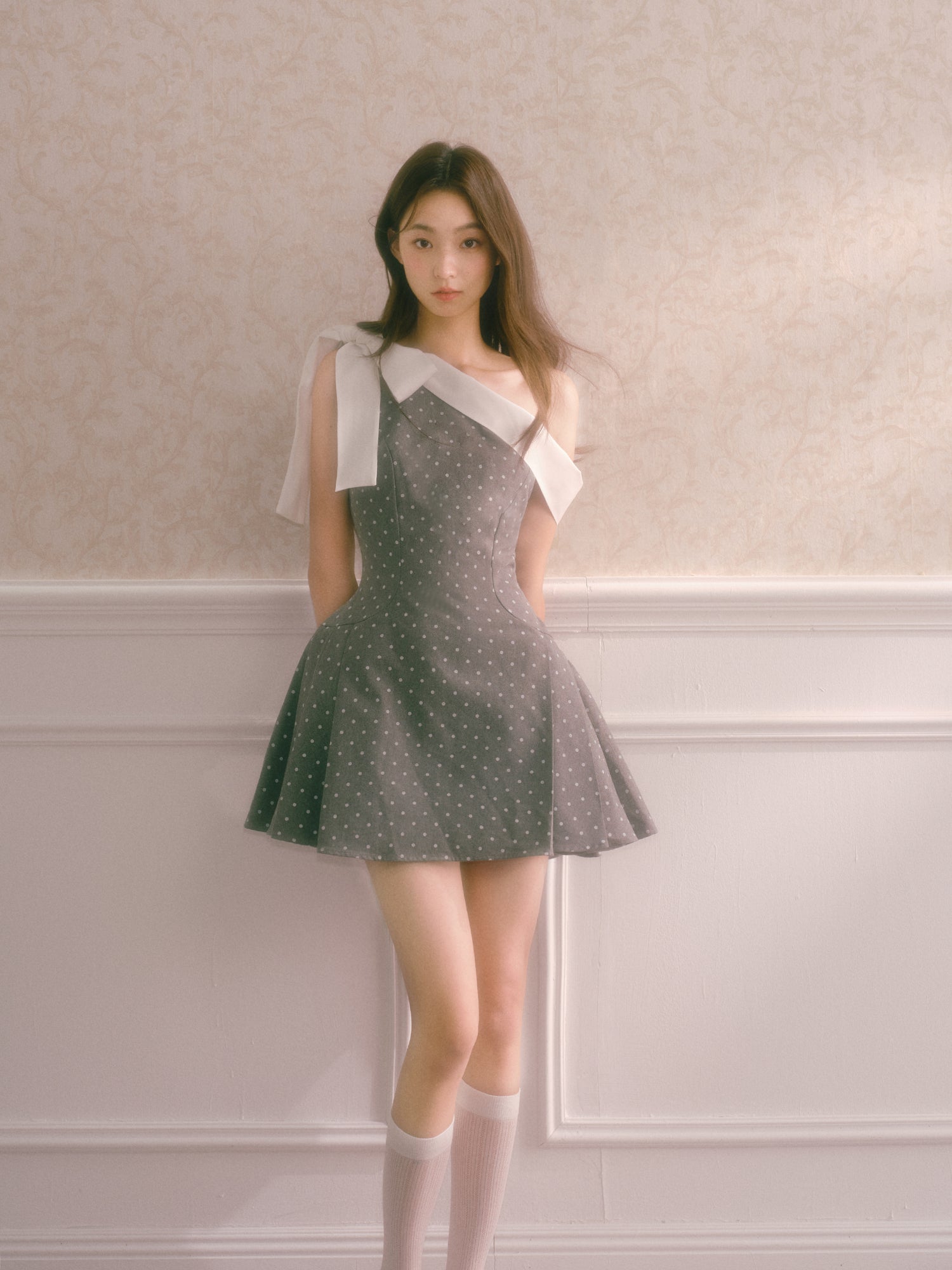 Gray polka dot off-shoulder niche dress with bow tie and waist-hugging puffy miniskirt R5127