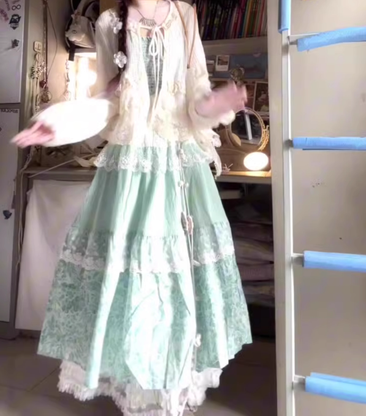 Green fake two-piece floral suspender dress gentle temperament waist A-line long skirt R0692