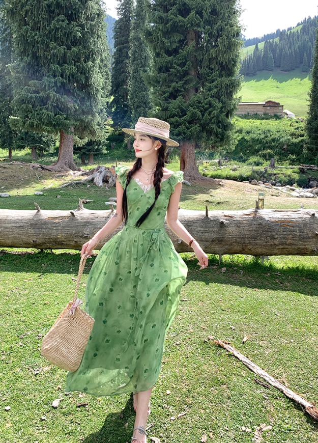 Green long v-neck small flying sleeve waist suspender dress summer temperament skirt R4906