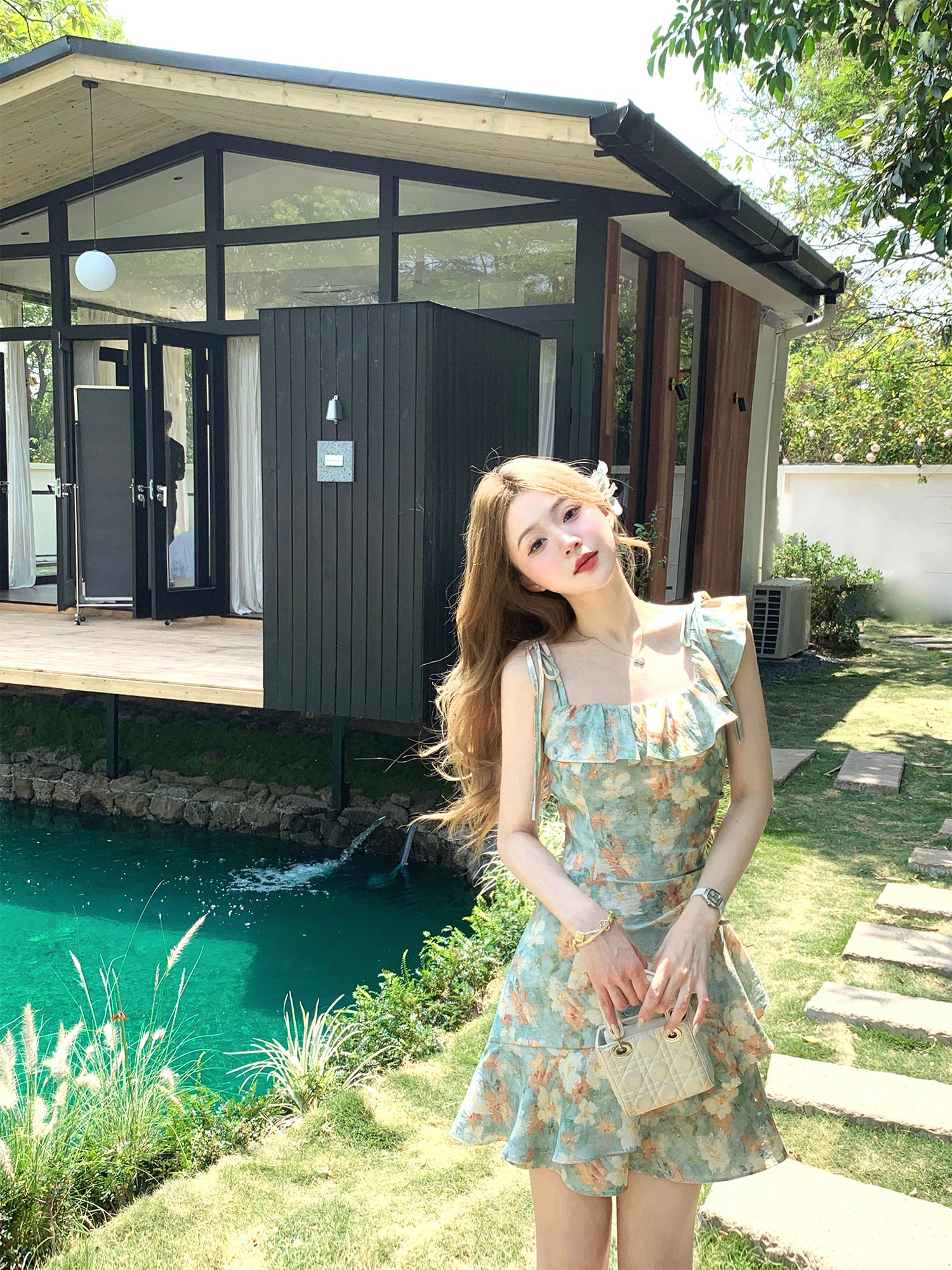 Green oil painting waist dress holiday design suspenders floral dress women summer R3909