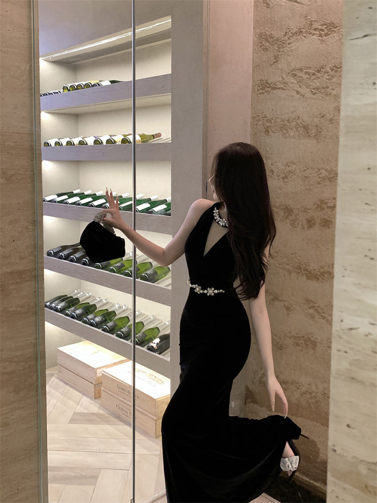 Hepburn style black dress high-end niche temperament heavy fishtail halter neck dress R1774