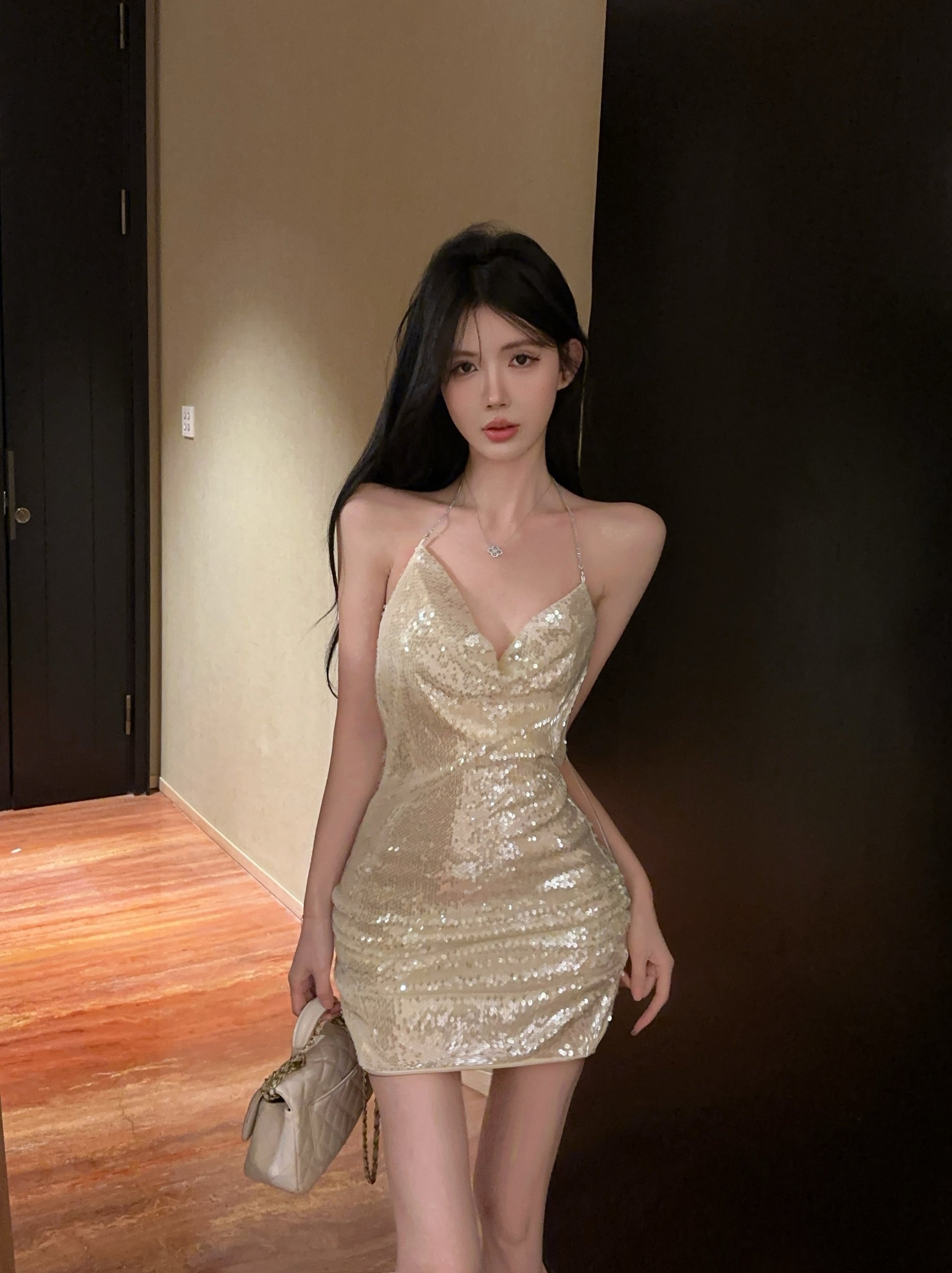High-end halter neck open back sequined dress pure sexy high waist slim fit dress R3754
