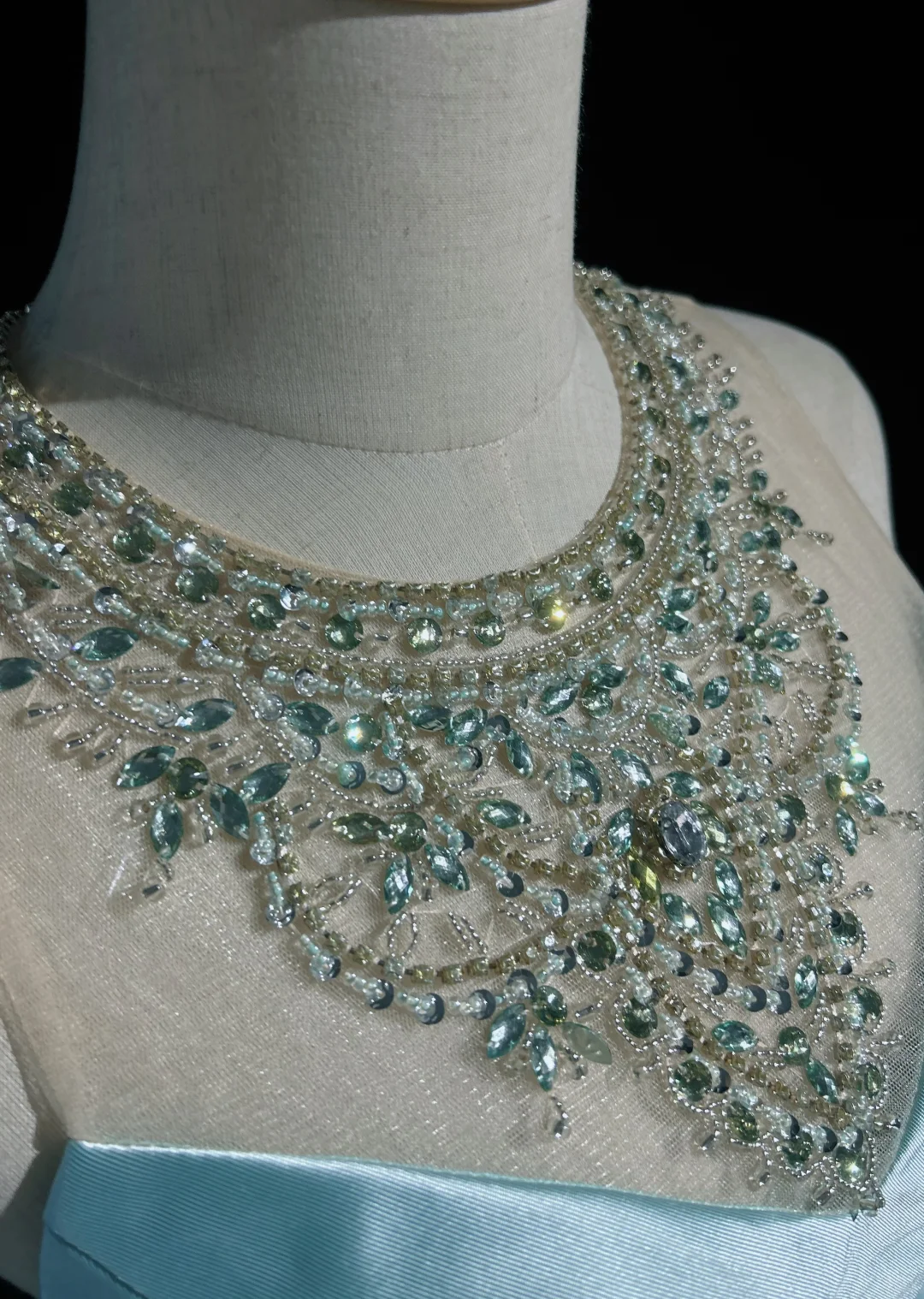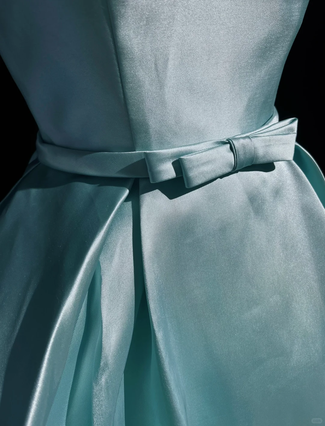 Lake blue round neck sheer diamond neckline waist slim fit princess short dress homecoming dress R4892