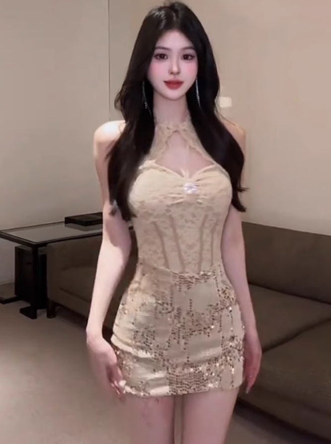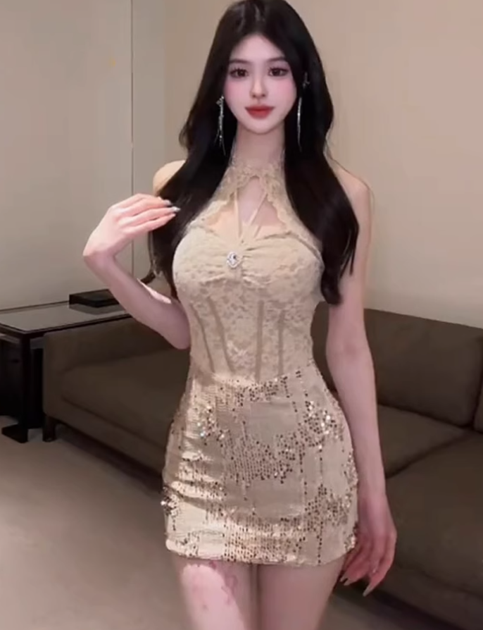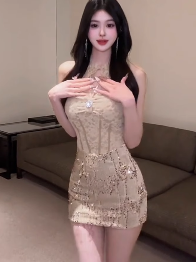 Large size French pure desire feeling lace patchwork dress sequin hip skirt R1864