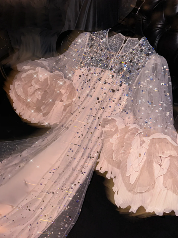 Light apricot round neck long sleeve fitted waist long ball gown, bridal dress R8761
