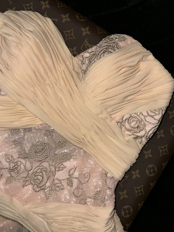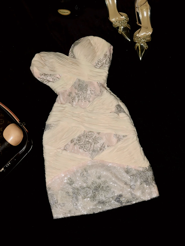 Light apricot strapless fitted waist bodycon short ball gown R6980