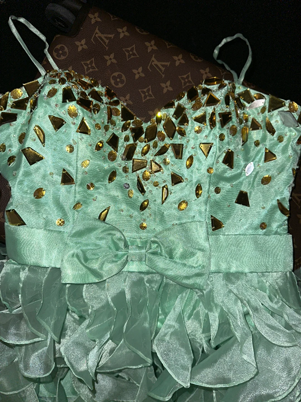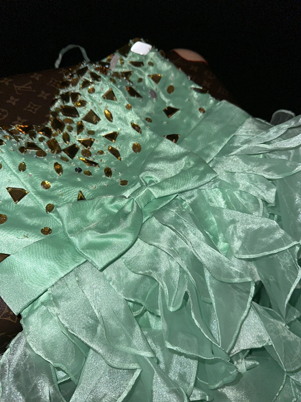Light green halter-neck fitted ball gown with an asymmetrical hem R7045