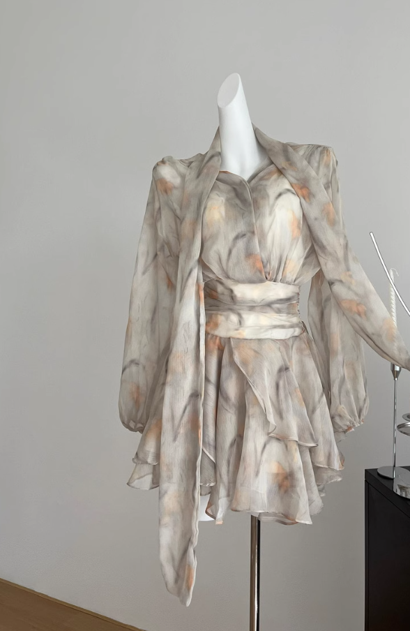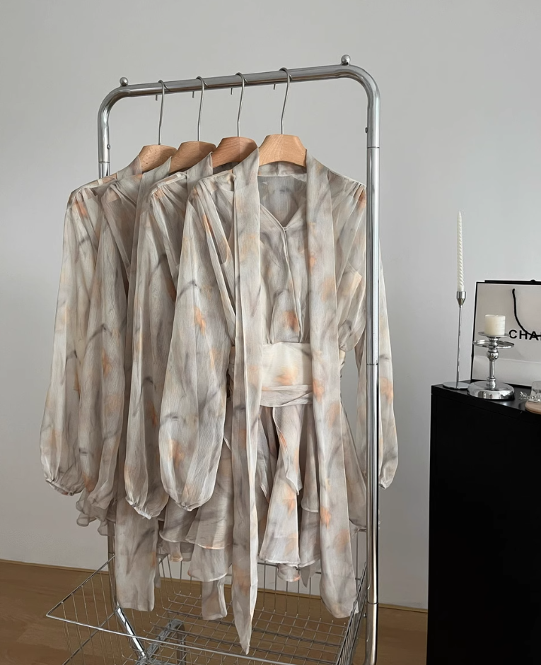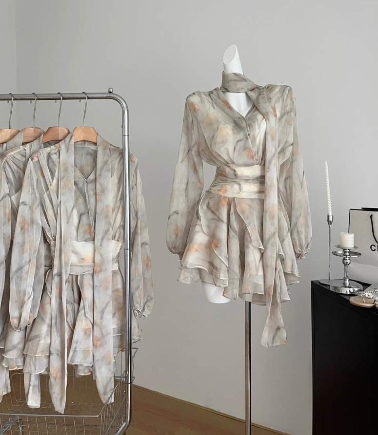 Long-sleeved V-neck puff sleeve chiffon yellow floral dress two-piece waisted short skirt R2106