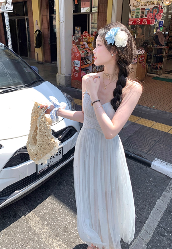 Long V-neck mesh suspender dress summer French loose slim skirt R4910